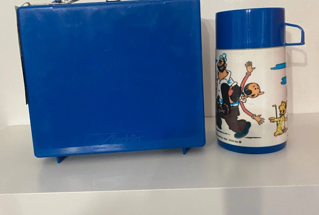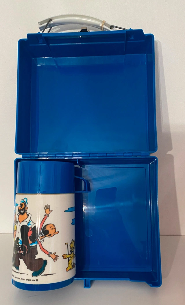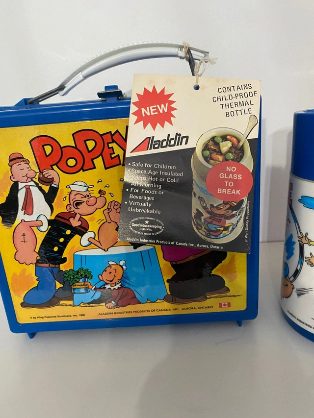 Saturday morning cartoons, munching on your favorite cereal would not be the same without Popeye and his adventures. You can now celebrate that classic cartoon nostalgia with this Aladdin Popeye Lunchbox and Thermos. This rare New Old Stock (NOS) Popeye lunch box and thermos combo collectible showcases vibrant, retro artwork featuring Popeye, Olive Oyl, Brutus and Wimpey. Unused with the original tags and thermos insert, this vintage lunchbox and thermos set is a must have for fans of the iconic Popeye the Sailor collectors or collectors of cartoon memorabilia. Imaging it perched atop your mantle of shelf as the centerpiece of your collection. Or the smile it will bring to your Add this rare Popeye lunch box and thermos to your collection or give the perfect gift for Popeye fan. Local pickup is in Etobicoke near Islington and The Westway.