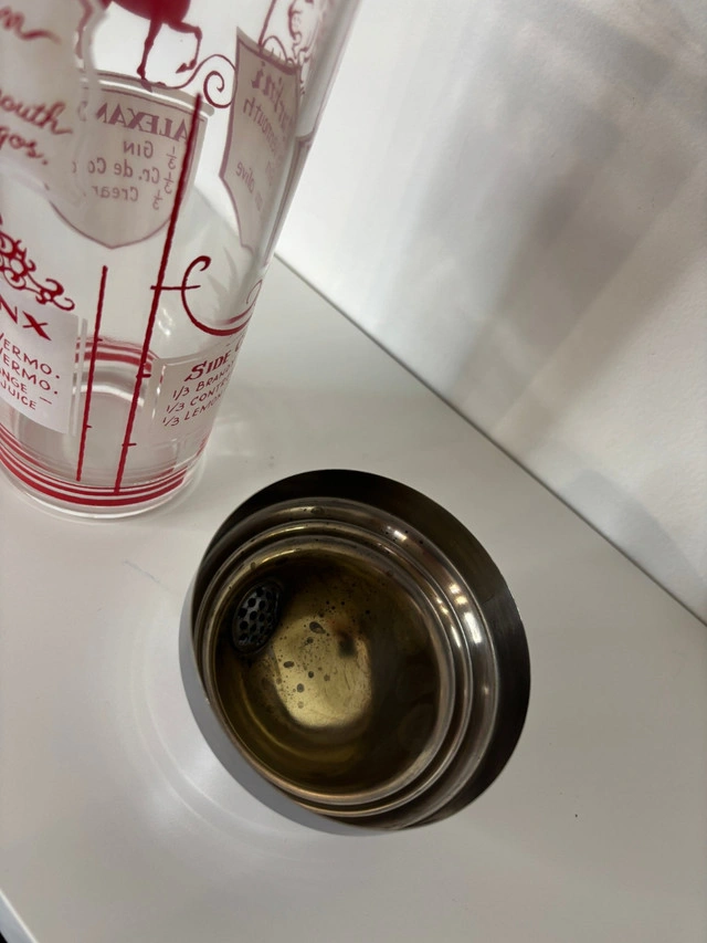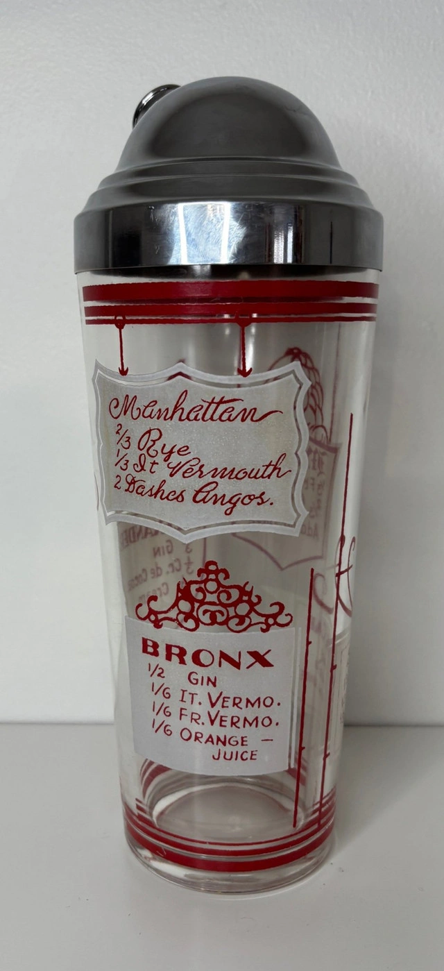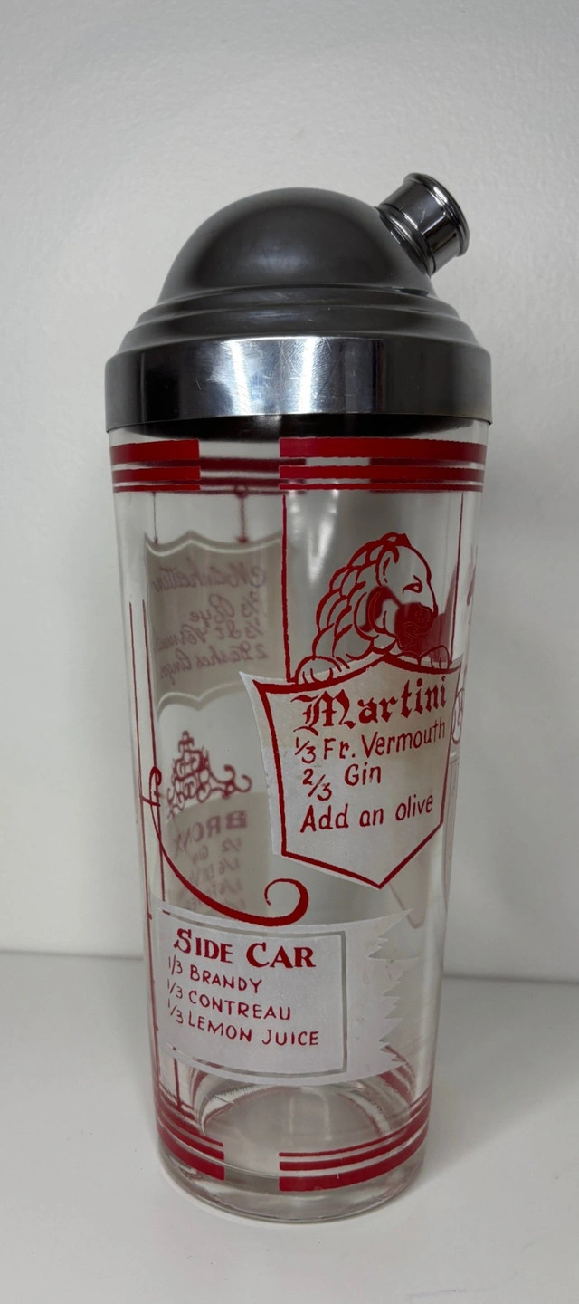Add character to your home bar with this Animal Theme Vintage Glass Cocktail Shaker. This functional and collectible piece features charming animal illustrations that bring a touch of classic bar nostalgia to cocktail hour. The detailed graphics capture mid century design, making it a cool addition to any vintage barware collection. Made from thick, clear glass with printed animal motifs in vibrant red, it is topped off with a metal lid that fits securely and allows for easy shaking and pouring. It is ideal for mixing classic cocktails or displaying as a conversation piece on your bar cart. For collectors of barware or home entertainers, you will appreciate its playful look and sturdy build. This Animal Theme Vintage Glass Cocktail Shaker blends practicality with vintage charm for those who enjoy classic entertaining with personality. Local pickup is in Etobicoke near Islington and The Westway.