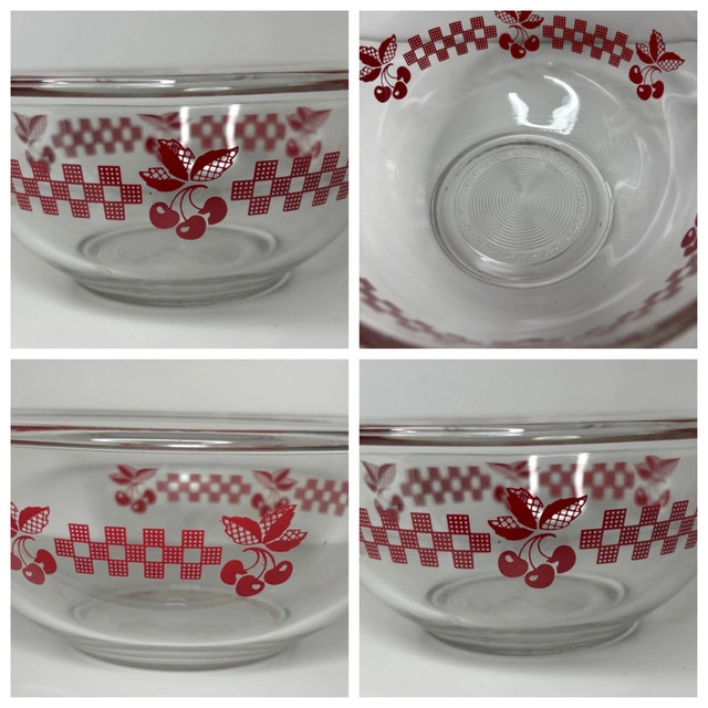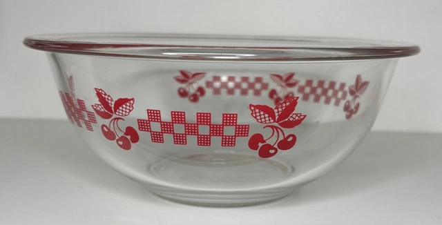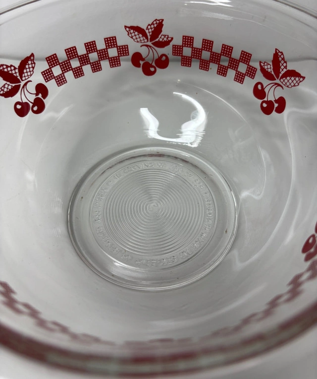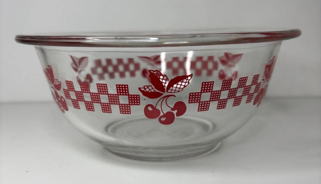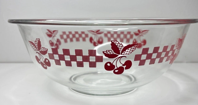 The Pyrex Cherry Design Glass Nesting Mixing Bowls will add a healthy dose of color, style, charm, and function to your kitchen. These vintage inspired bowls capture the beauty of classic Pyrex with a cheerful red cherry pattern and durable clear glass body. Made from tempered glass, they offer strength, a clean look, and resistance to stains and odors. The sizes make these bowl great for mixing batter, tossing salads, or preparing dough. A flared rim adds a great design feature that allows for easier handling while whipping up your favorite recipe or serving a thoughtful, home cooked meal. The classic nesting design saves space and pairs beautifully with other Pyrex cherry pattern bowls. The Pyrex cherry pattern is valued by collectors and cooks alike for its nostalgic appeal and vintage craftsmanship. Home bakers love its functionality and versatility in helping create great food offerings. These Pyrex cherry themed bowls are great if you are starting your vintage Pyrex collection or completing your existing set. They add beauty and practicality to your kitchen. Own a piece of Pyrex history that combines style, strength, and everyday usefulness with these Pyrex Cherry Design Glass Nesting Mixing Bowls. Prices for each as follows: 7 inch - $35 8 inch - $40 10 inch - $45 Full set - $110