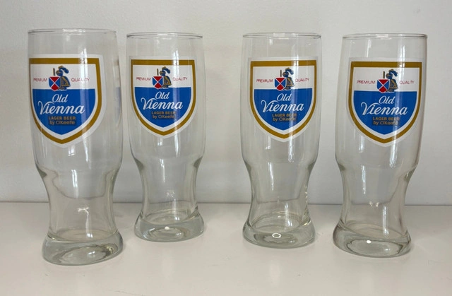 Let your taste buds dance with joy as you sip your favorite beer from these Old Vienna Lager Pilsner Beer Glasses. Designed for beer lovers and brewery collectors, these classic pilsner glasses feature a unique and sleek, tapered shape that enhances carbonation and aroma, making your favorite lager or ale achieve the perfect pour every time. The iconic Old Vienna Lager logo makes this Old Vienna Lager Pilsner Beer Glass Set ideal for enjoying your favorite lagers and pilsners and enhancing your home bar or pub. A rare beer collectible piece of memorabilia, these Old Vienna glasses will become a standout conversation piece amongst family and friends as you entertain at home. These Old Vienna Lager Pilsner Beer Glasses measure approximately 7.25 inches or 19cm tall. This listing is for a set of 4 glasses that are in excellent condition. Add a slice of nostalgia and history to your home with this stunning Old Vienna Lager Pilsner Beer Glass Set. The listing price is for a set of 4 glasses. Local pickup is in Etobicoke near Islington and The Westway.