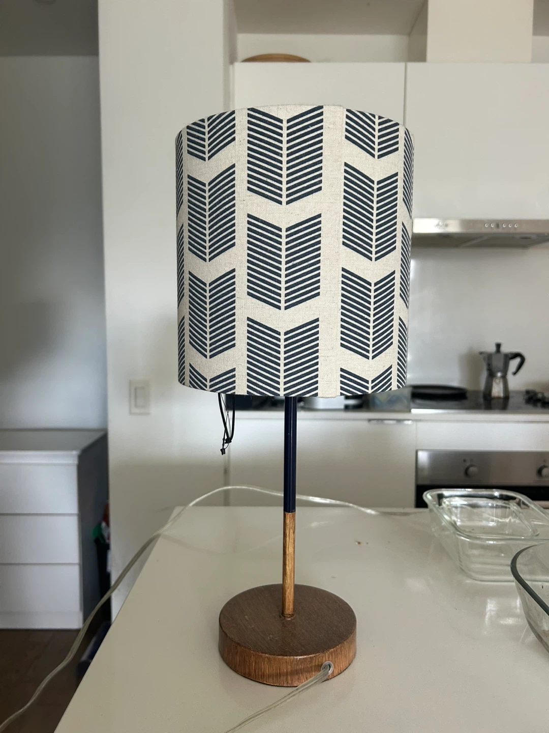 Selling a table lamp with a unique patterned shade. It features a wooden base and a sleek design that would look great in any room. The shade has a blue and white arrow pattern. It's in great condition and ready to brighten up your space