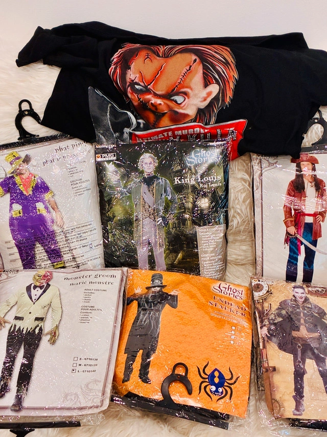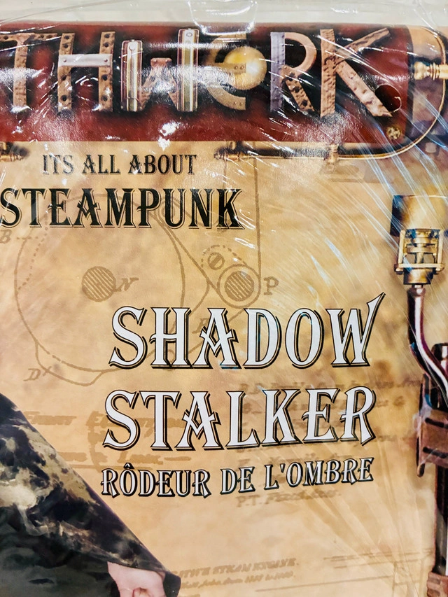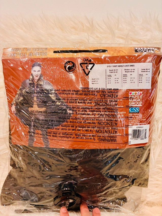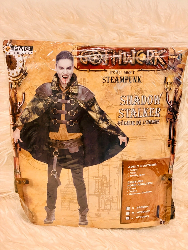 Get ready to haunt this Halloween with this awesome "Shadow Stalker" costume! Features a cool steampunk vampire vibe with a cape, vest, and utility belt (as pictured on the package). Never tried on, still in original packaging. Perfect for parties, trick-or-treating, or cosplay! Large size. Note that there more costumes available! Fixed price. For Sale By: Owner