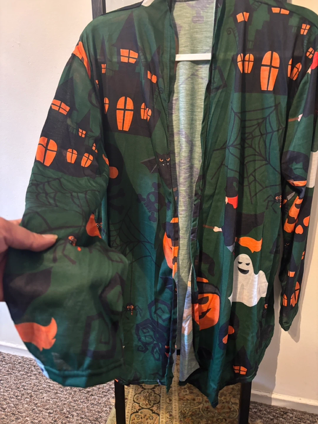 Fun Halloween themed kimono with a spooky print! Features bats, skeletons, pumpkins, and ghosts on a green and orange background. Perfect for adding a festive touch to your outfit this Halloween season! 10 for one or 25 for three of them