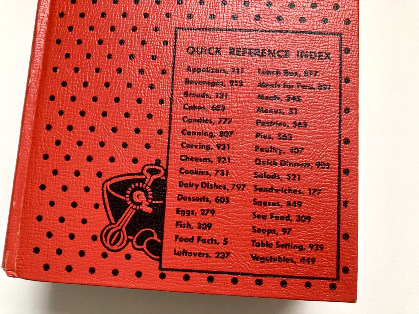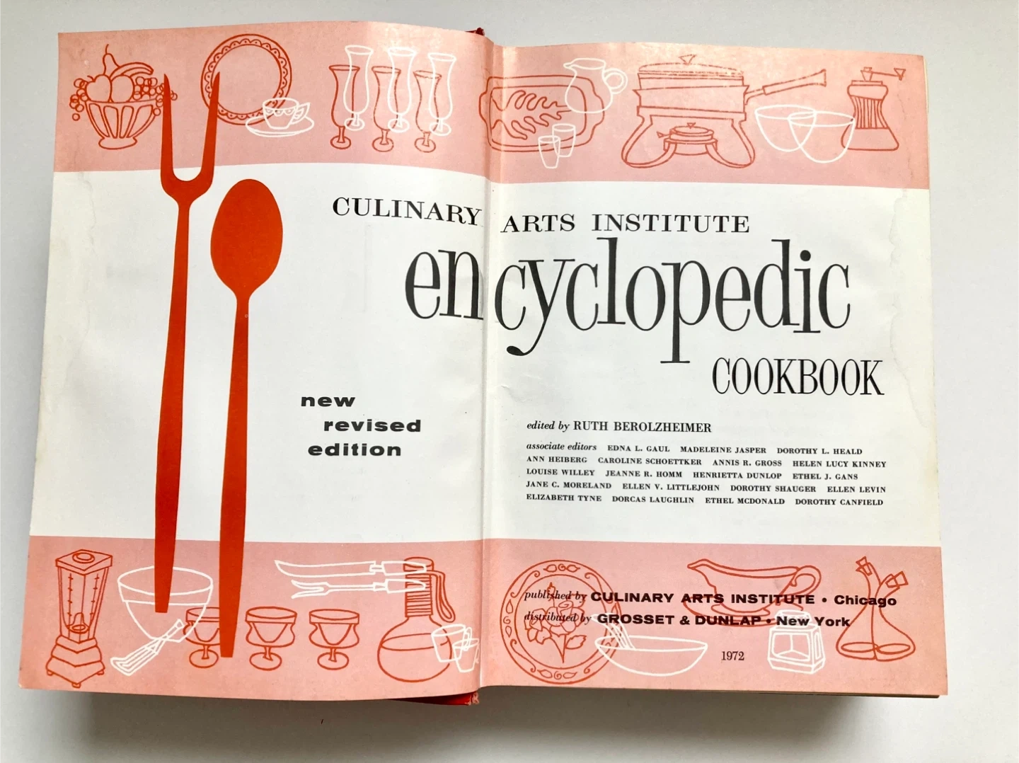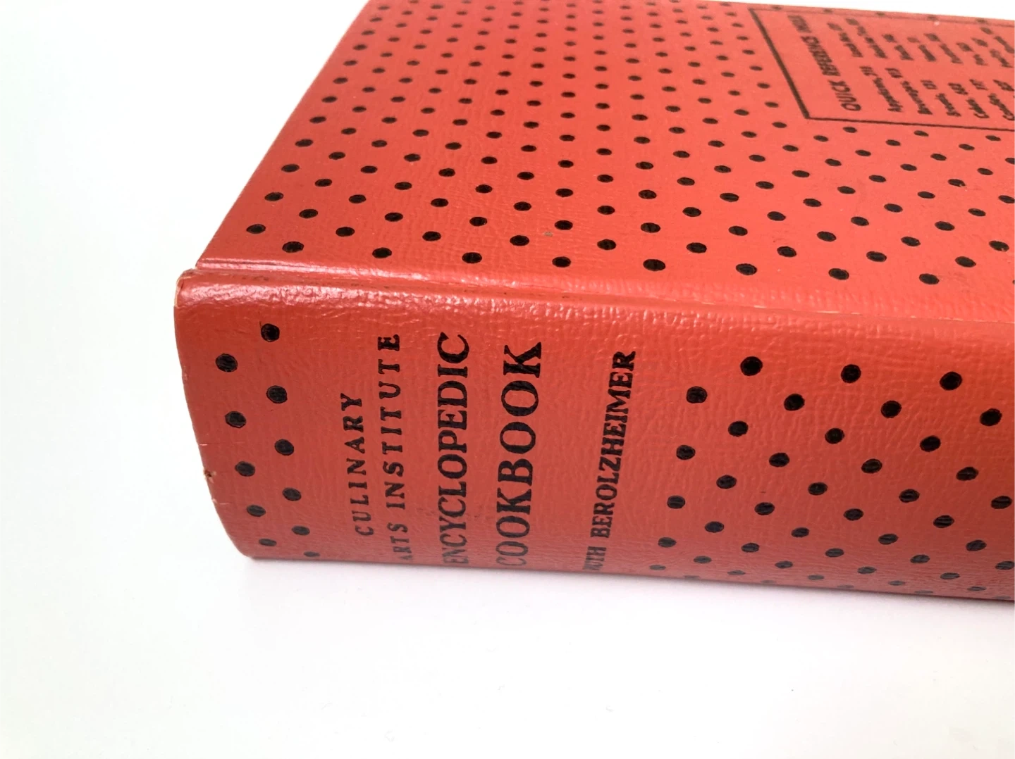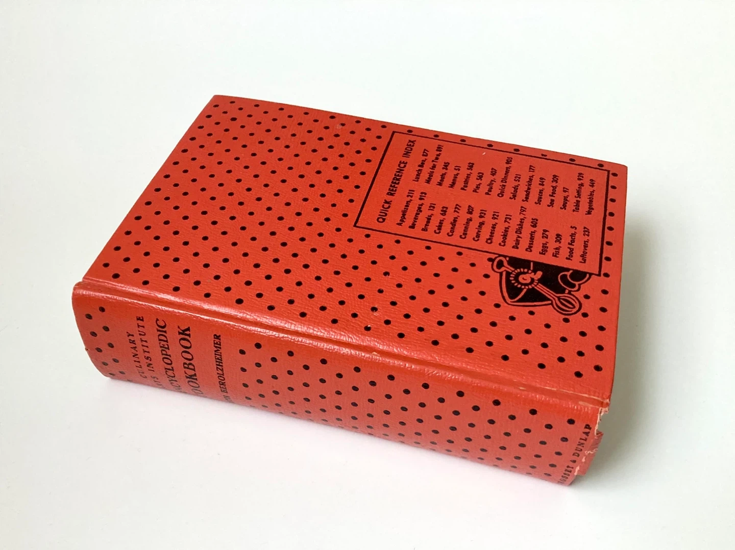 Very cool vintage book: Culinary Arts Institute Encyclopedic Cookbook. This is the 1972 edition. Tons of recipes and food information. Fully illustrated with photographs on nearly every page. 974 pages. The cover is also a beautiful coral red with polkadots, and would look charming on a kitchen shelf. Very good condition with just some minor damage on the lower spine and some water stains on the first couple of pages. Pick up in the Ossington and Davenport area. Check my other listings for more vintage home decor and books 🙂