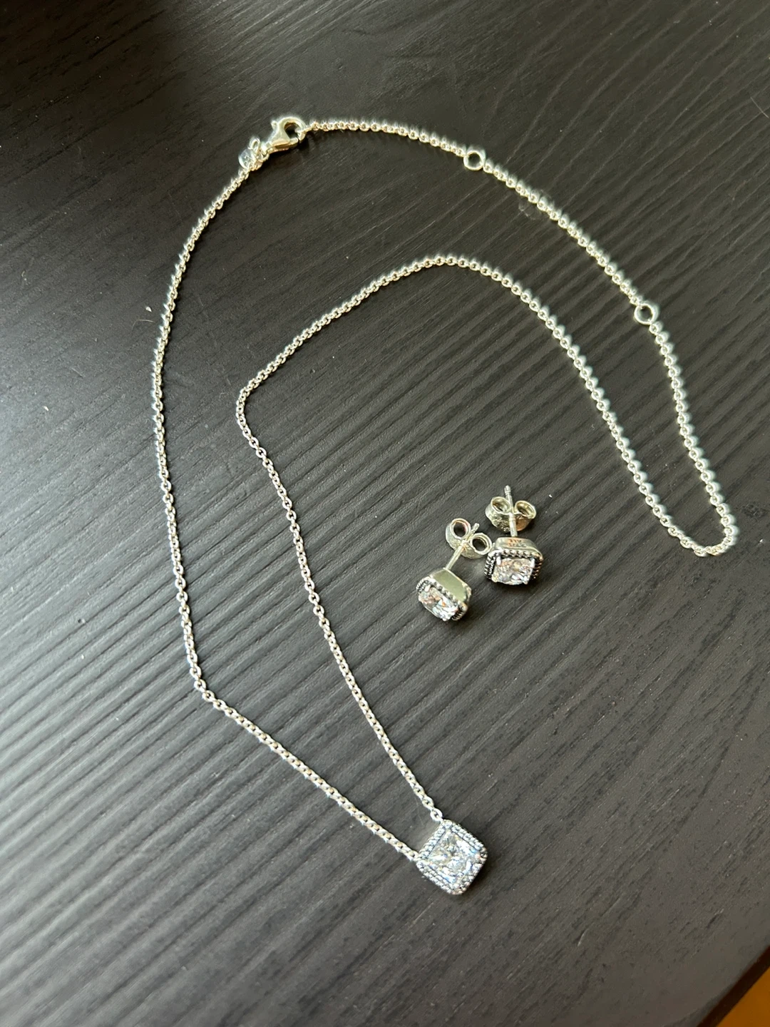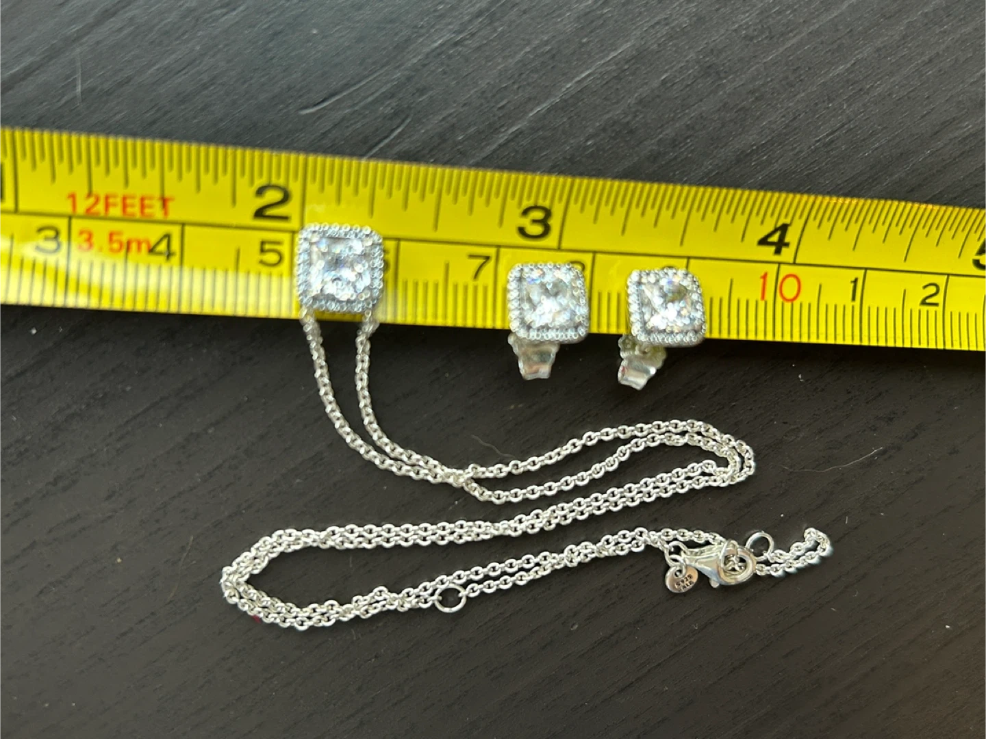 Selling a lovely necklace and earring set! The set is made of S925 ALE silver. The earrings and pendant feature a square cubic zirconia stone. Chain is adjustable 15”, 17”, 18”. Great for adding a touch of sparkle to any outfit