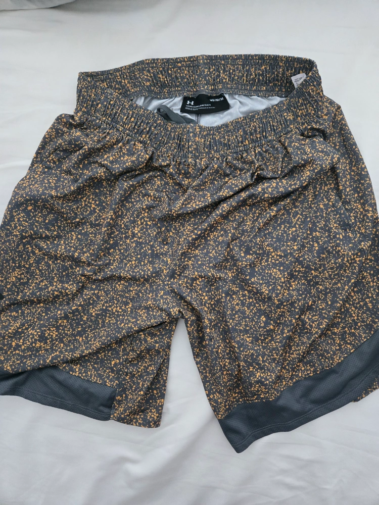 Selling a pair of Under Armour shorts in size medium. The shorts feature a grey base with a speckled pattern. Perfect for workouts or casual wear!
