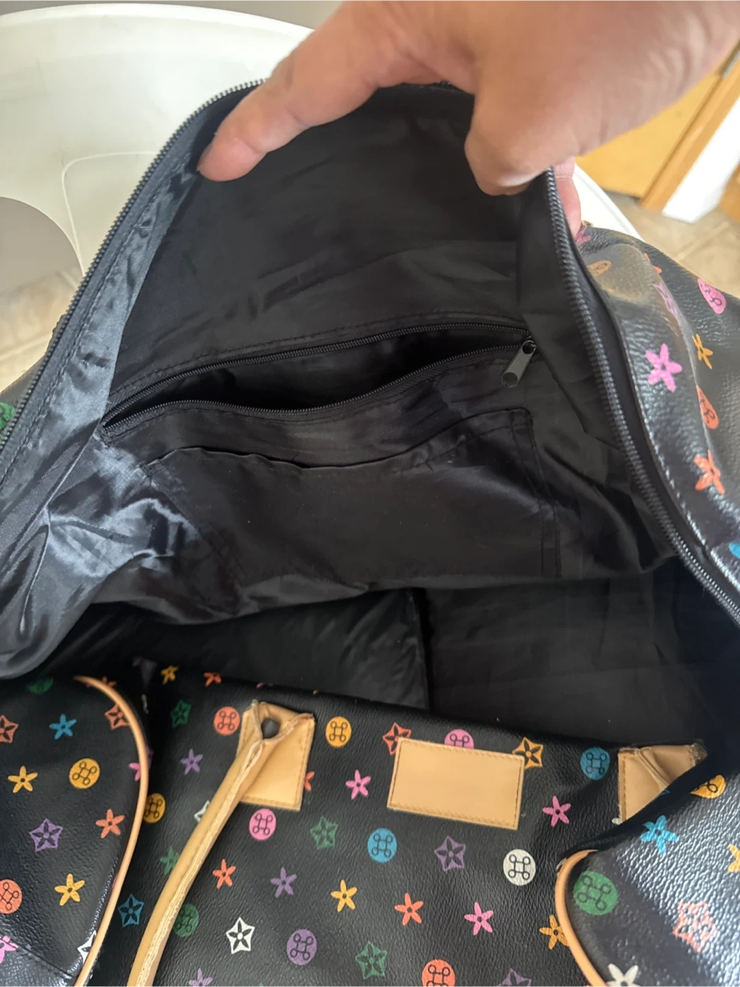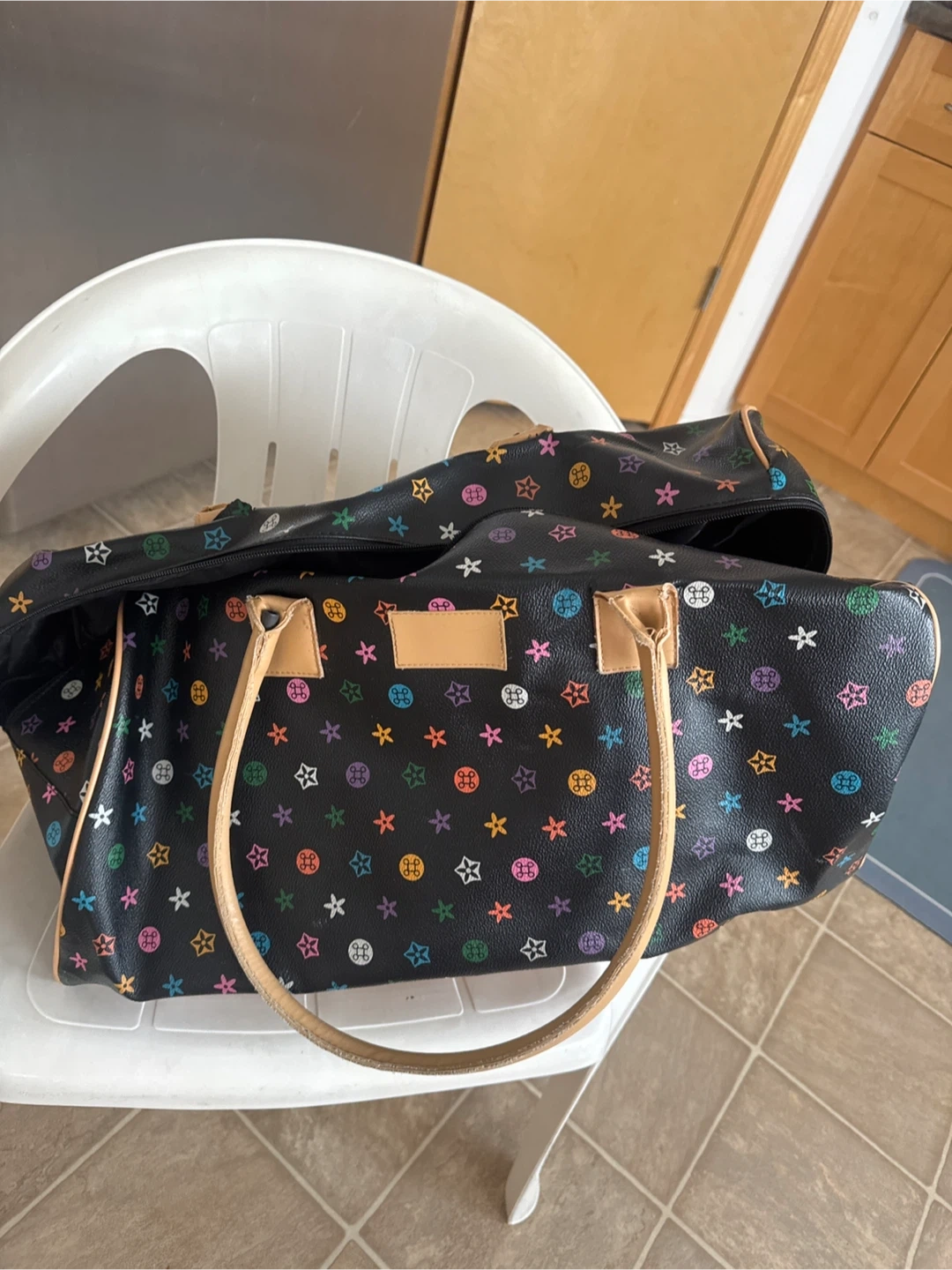 This is a duffle bag with a fun pattern on it! It's black with colourful stars and circle designs. It has tan handles. It's in good condition and ready for your next trip to the gym or a weekend getaway - but you need to fix the zipper (or replace zipper). I do not have time to fix it