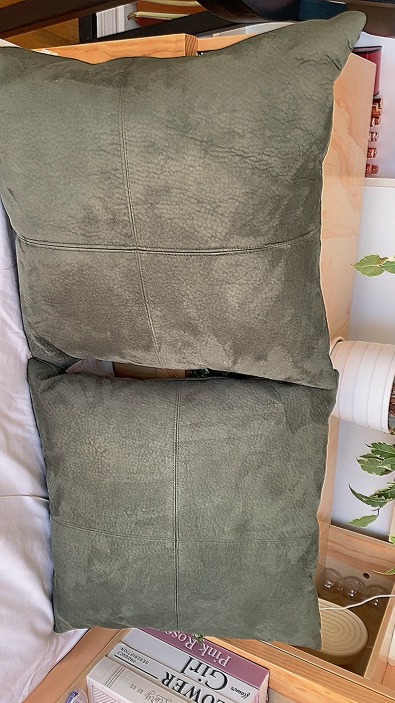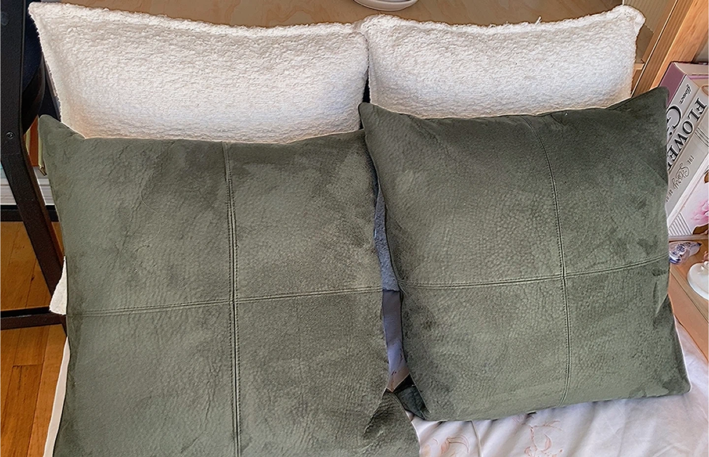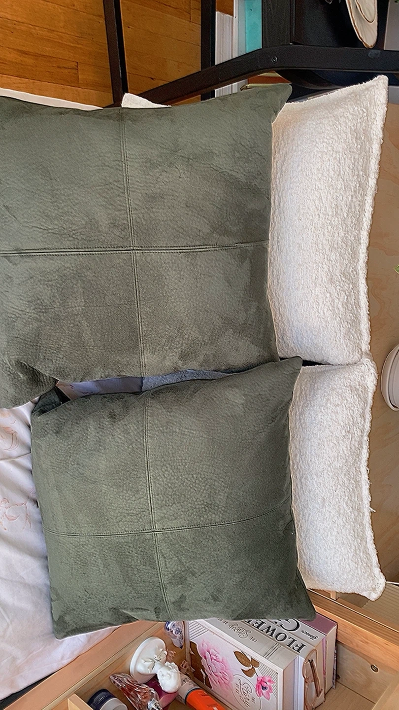 A collection of throw pillows in varying textures and designs! There are green suede-like pillows and white fluffy ones, plus a patterned throw. Perfect for adding some cozy vibes to your space