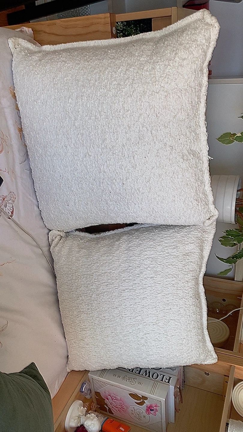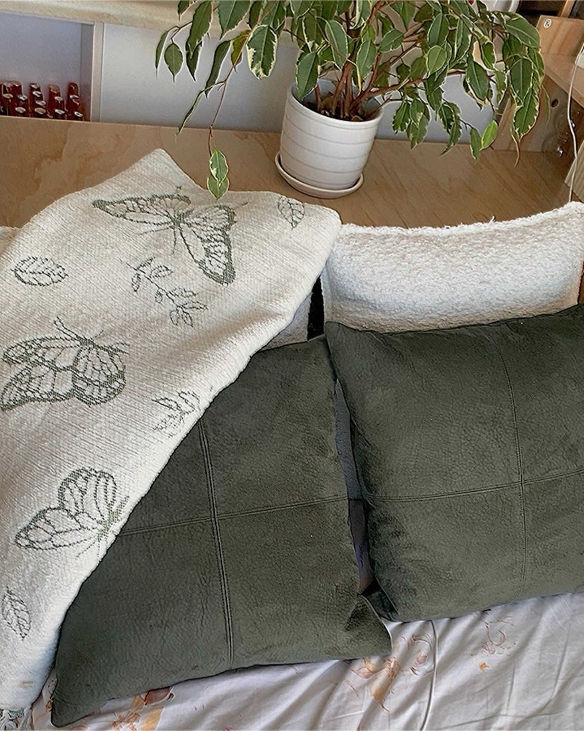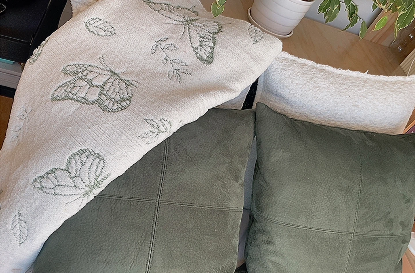 A collection of throw pillows in varying textures and designs! There are green suede-like pillows and white fluffy ones, plus a patterned throw. Perfect for adding some cozy vibes to your space