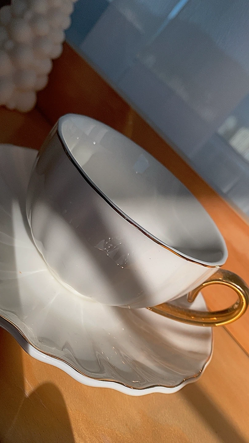 Selling a lovely teacup and saucer set! The teacup is white with a delicate gold trim, and the saucer has a matching scalloped edge. It's perfect for enjoying a relaxing cup of tea or coffee. The set is in great condition and ready for a new home