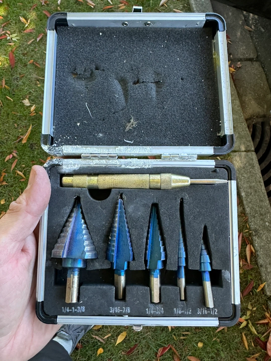 Selling a step drill bit set, complete with a handy carrying case! The set includes various sizes, ranging from 1/4-1-3/8 to 3/16-1/2, so you'll be prepared for different drilling needs. It also includes a punch pin.