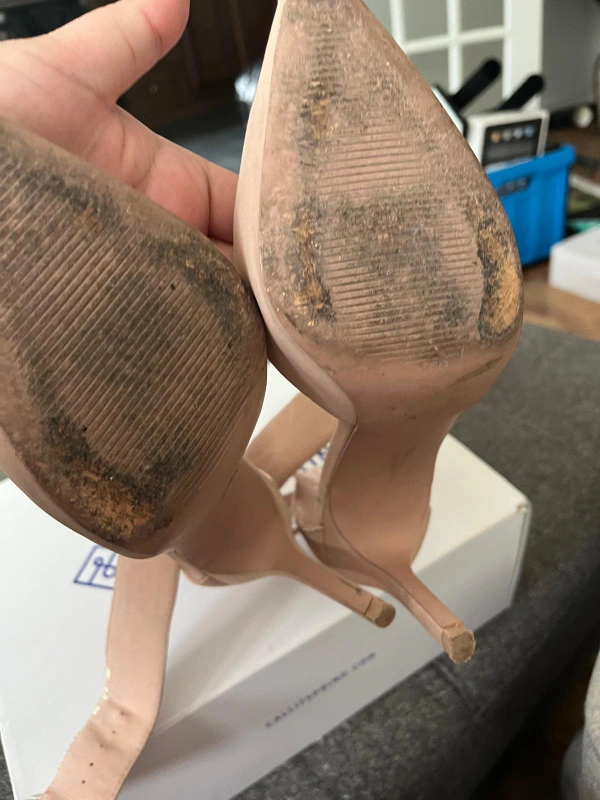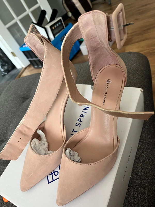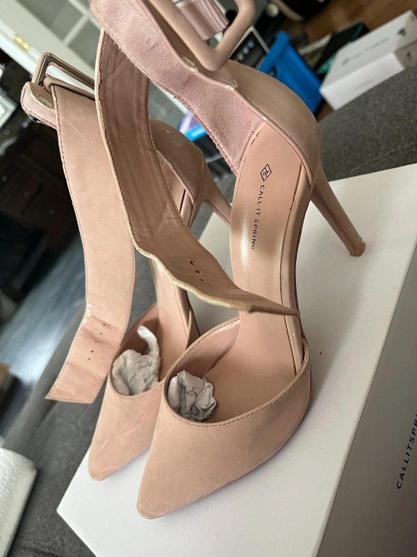 These heels feature a stylish ankle strap and are perfect for dressing up any outfit. They have some signs of wear, as shown in the photos.