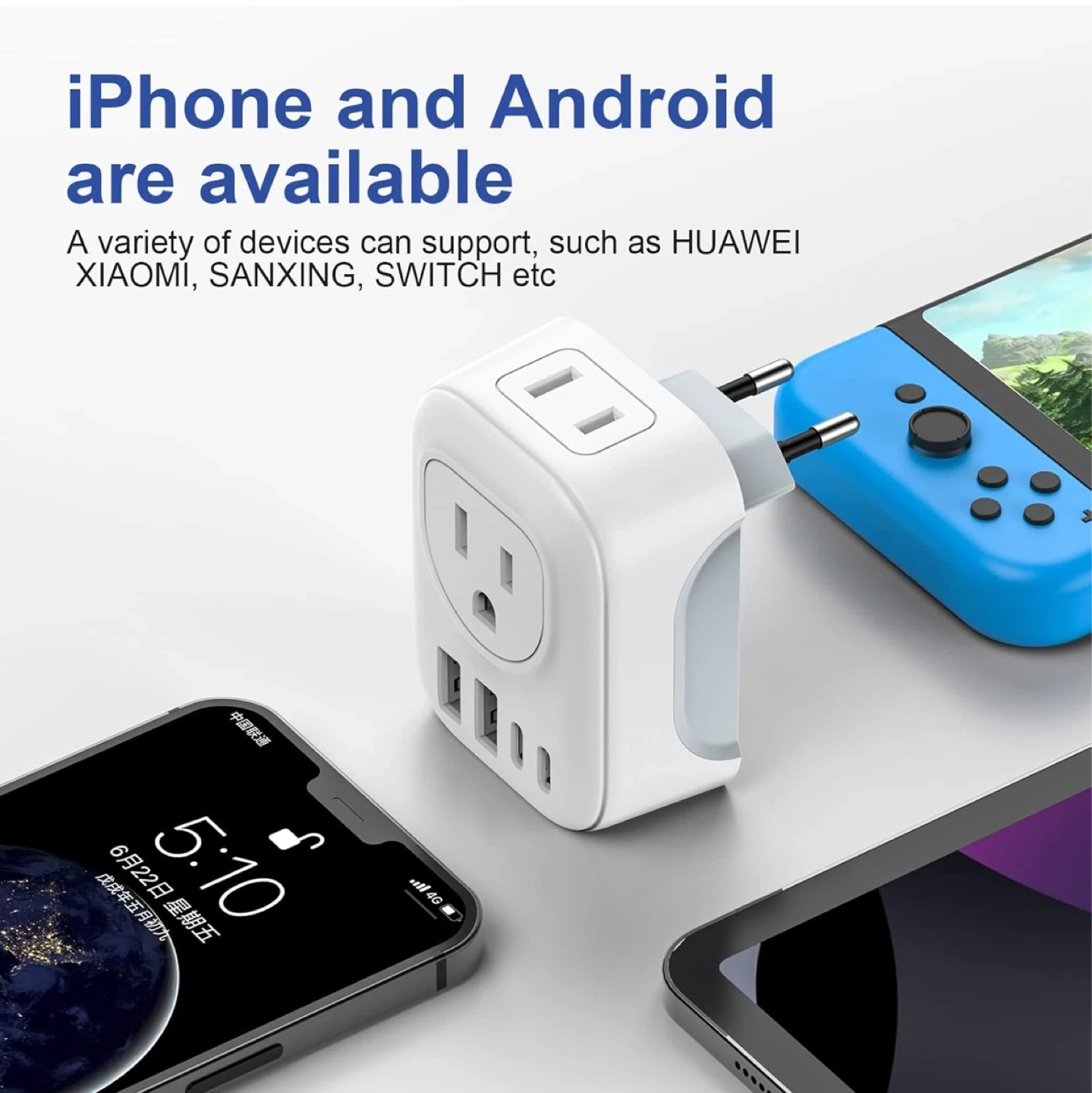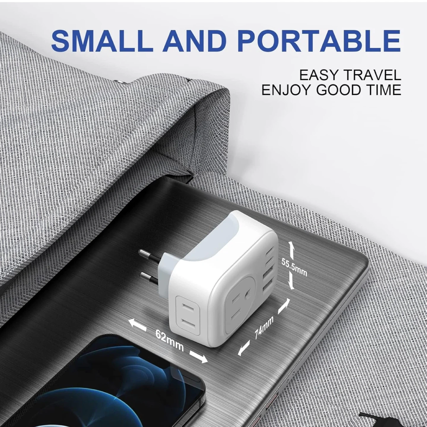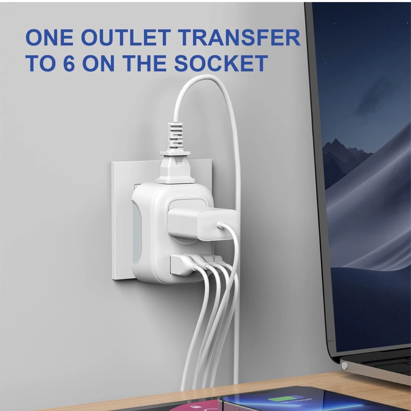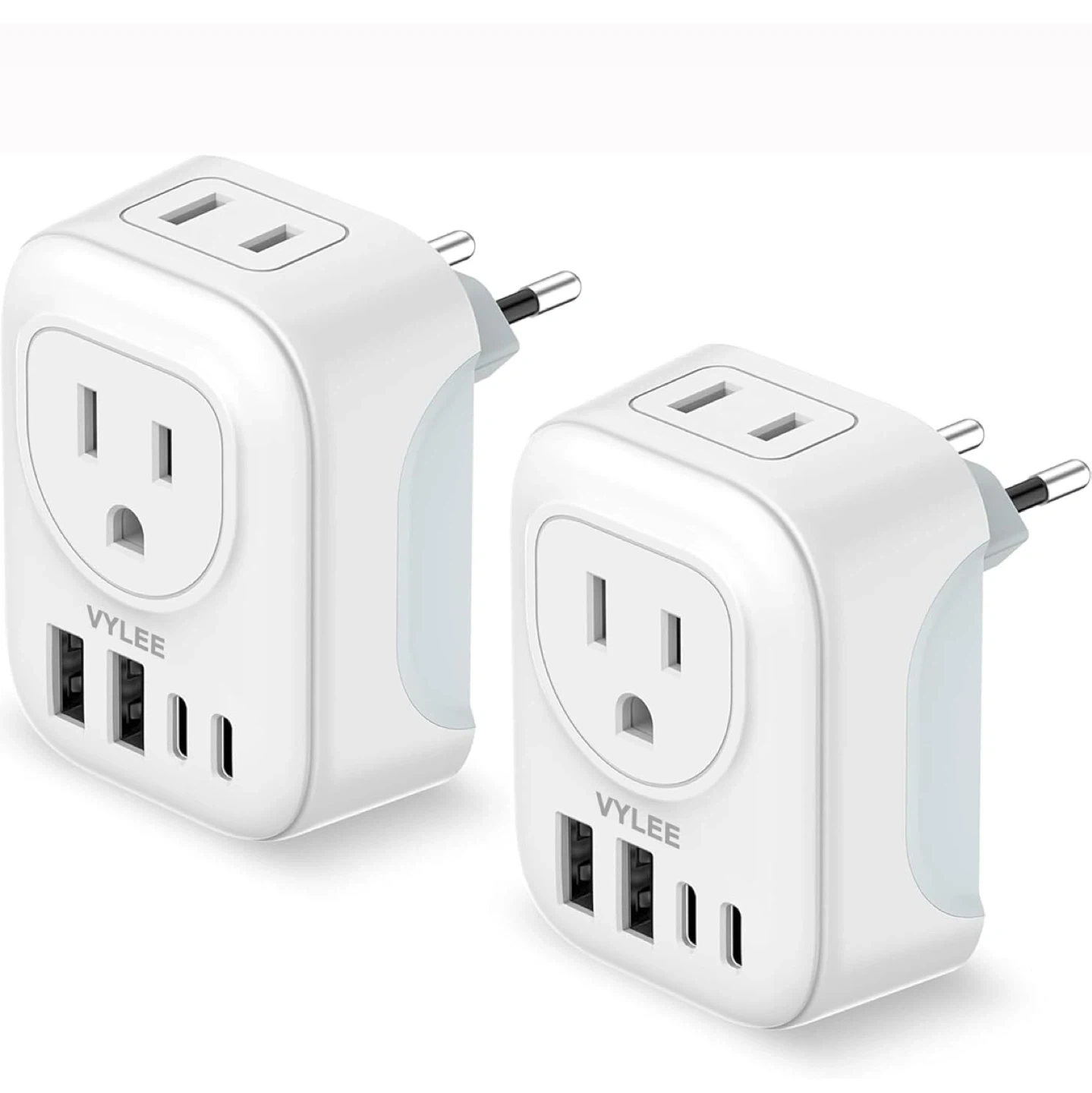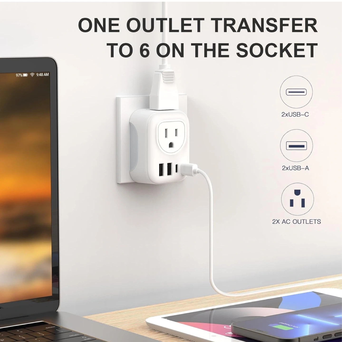 This Vylee travel adapter is small and portable, perfect for travel! It turns one outlet into six, with 2 USB-C ports, 2 USB-A ports, and 2 AC outlets. It's super handy for charging multiple devices at once.