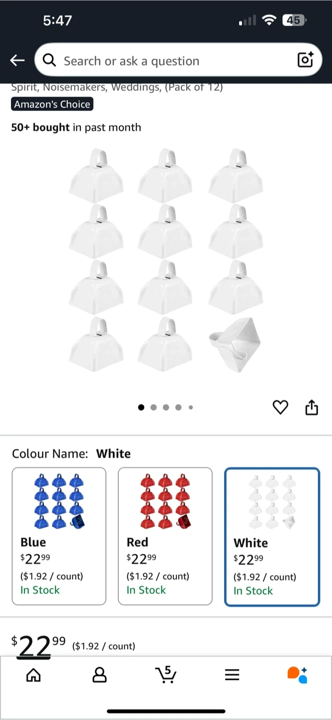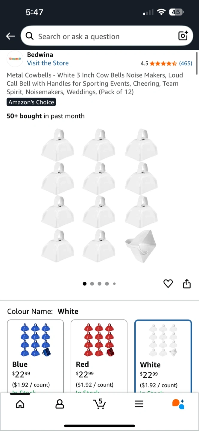 Selling 23 Bedwina white cowbells! These metal cowbells are 3 inches in size and perfect for sporting events, cheering, team spirit, noisemakers, and weddings. They are brand new and come in the original box. There’s 23 individual bells available . They are in original packaging unused. 12 pack retails for $22.99 Looking to sell all 23 for $20 price firm