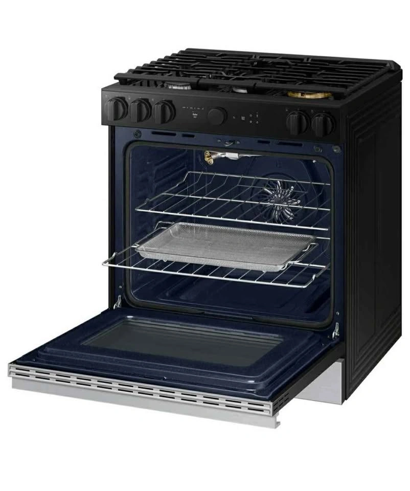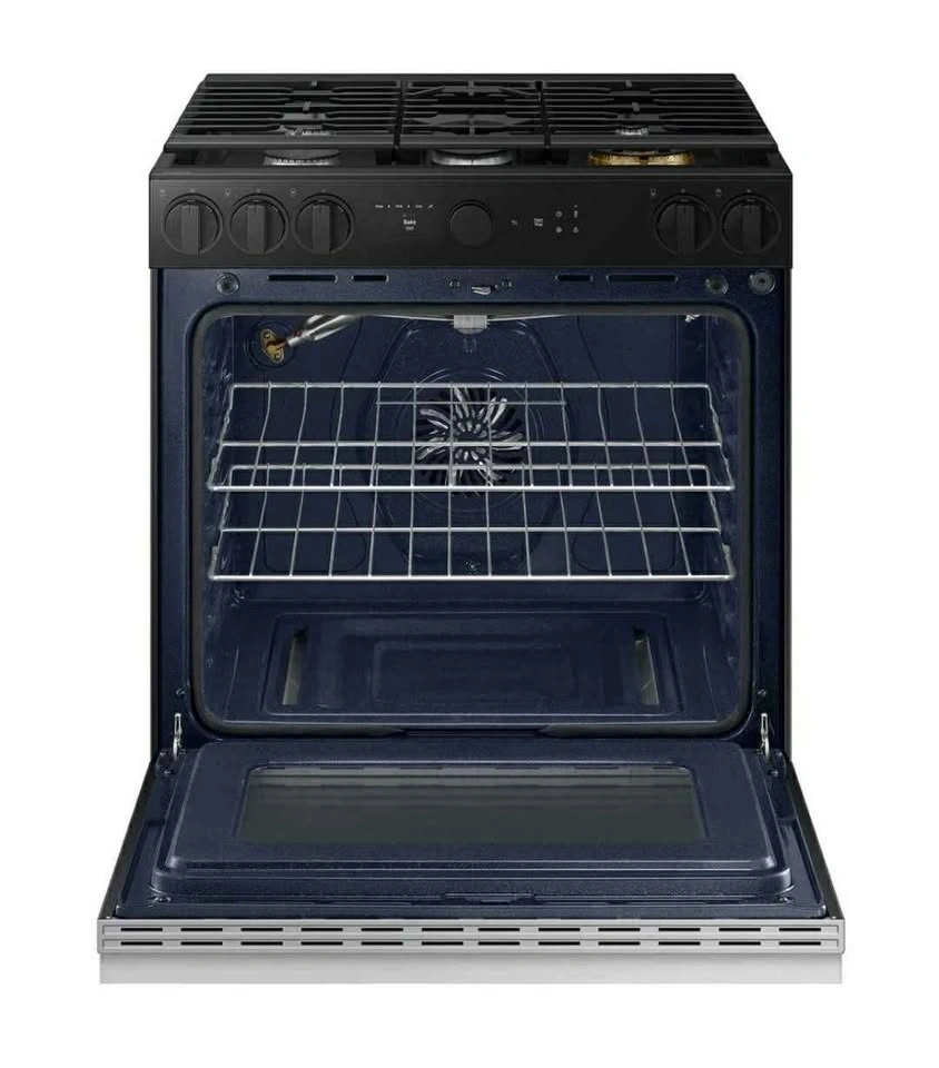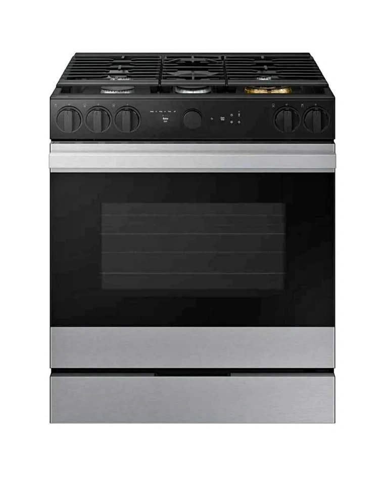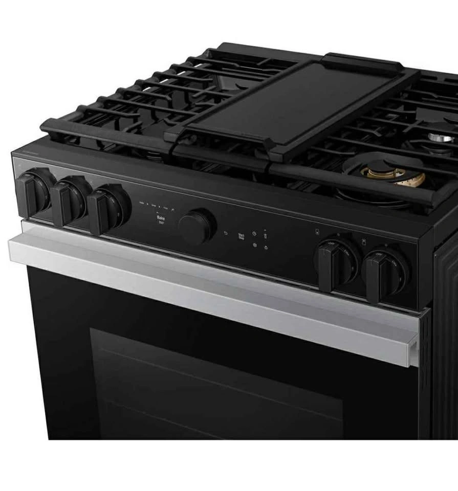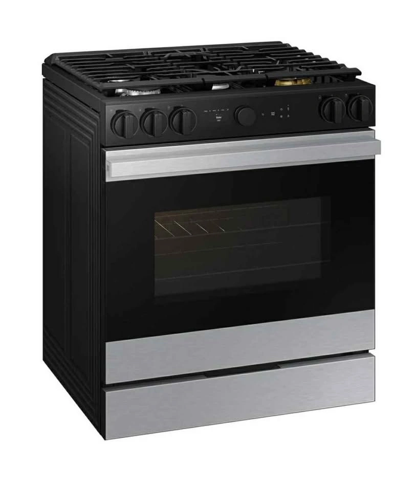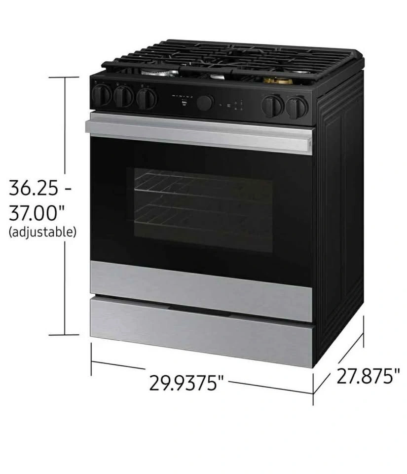 Samsung BESPOKE Smart Slide-in Gas Range with True Convection and Air Fry in Stainless Steel BRAND NEW NO BOX IN PLASTIC $1265 MODEL NUMBER NSG6DG8500SR Samsung's smart gas range features a stylish and contemporary Bespoke design with a recessed handle. Air Sous Vide locks in flavor and moisture so you can enjoy gourmet cooking at home, and Air Fry lets you cook healthier fried food. Requires a sous vide cooking bag, which is not included with the oven. As compared to deep frying. Give your kitchen a premium look with a contemporary Bespoke design and a recessed handle that suits your style and elevates your home. Lock in flavor and moisture and avoid overcooking using Air Sous Vide. Requires a sous vide cooking bag, which is not included with the oven Enjoy healthier fried foods with Air Fry built right into your oven. Air Fry tray included. As compared to deep frying. Quickly cook vegetables to crispy perfection with Convection Vegetable. Precisely control and ensure proper activation of your cooktop with integrated knob buttons. Convection+ lets you cook your food faster and more evenly than standard Convection by circulating only hot air throughout your oven. As compared to standalone Samsung convection ovens. Control your range with an intuitive 2.25'' LCD display. Get fast, even cooking with the powerful heat of the 18K BTU Brass Burner. Quickly and evenly grill, sear and saute food without oil on the lightweight Aluminum Griddle. Edge-to-edge cast iron grates create a larger cooking surface. Use Self Clean to deeply clean your oven with high heat. Fingerprint resistant finish. White Glass finish is not fingerprint resistant.