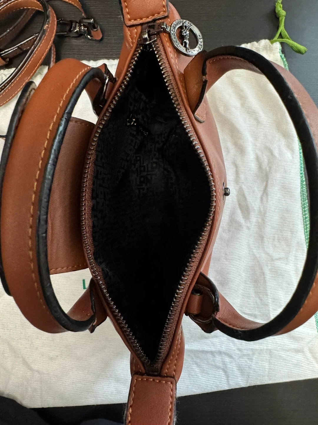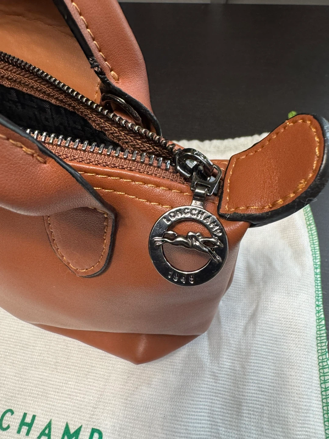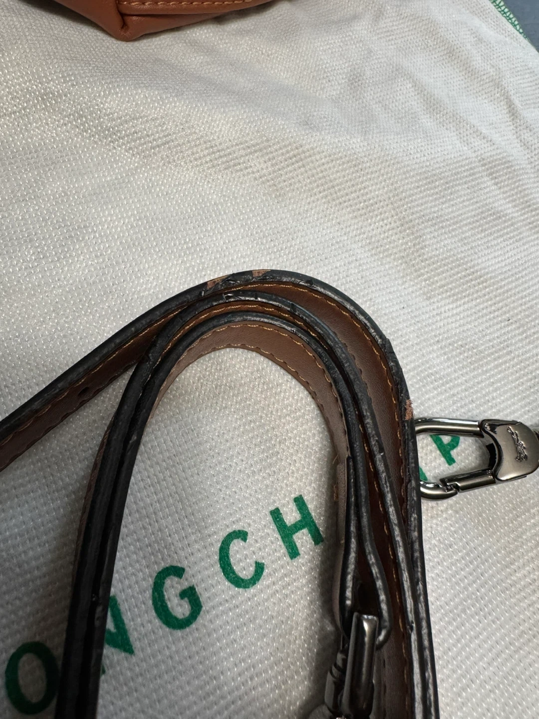 Hello, selling some of my families old/unused luxury bags. Selling a Longchamp Le Pliage Cuir mini top handle bag in a beautiful brown leather! Comes with its original dust bag and strap. Details: Bag is very good condition, soft leather no blemishes. Left corner flail has some rubbing damage. Minor not major. Second last photo* Strap has some damage along the sides as shown in last photo. *pre-owned *original retail is $705cdn *comes with dust bag