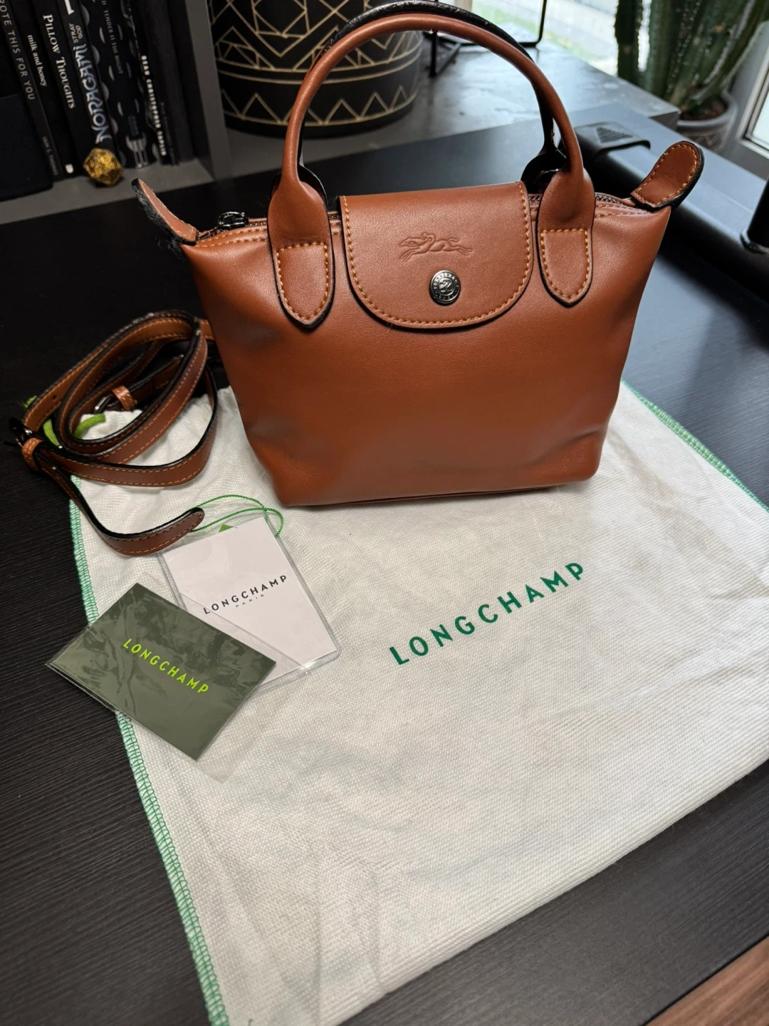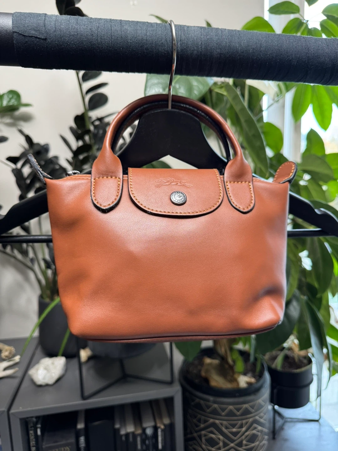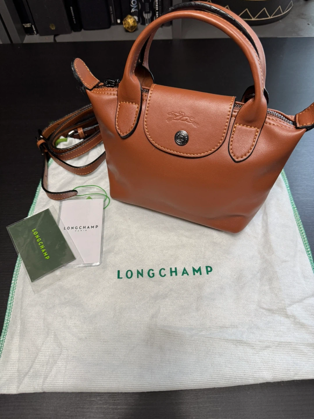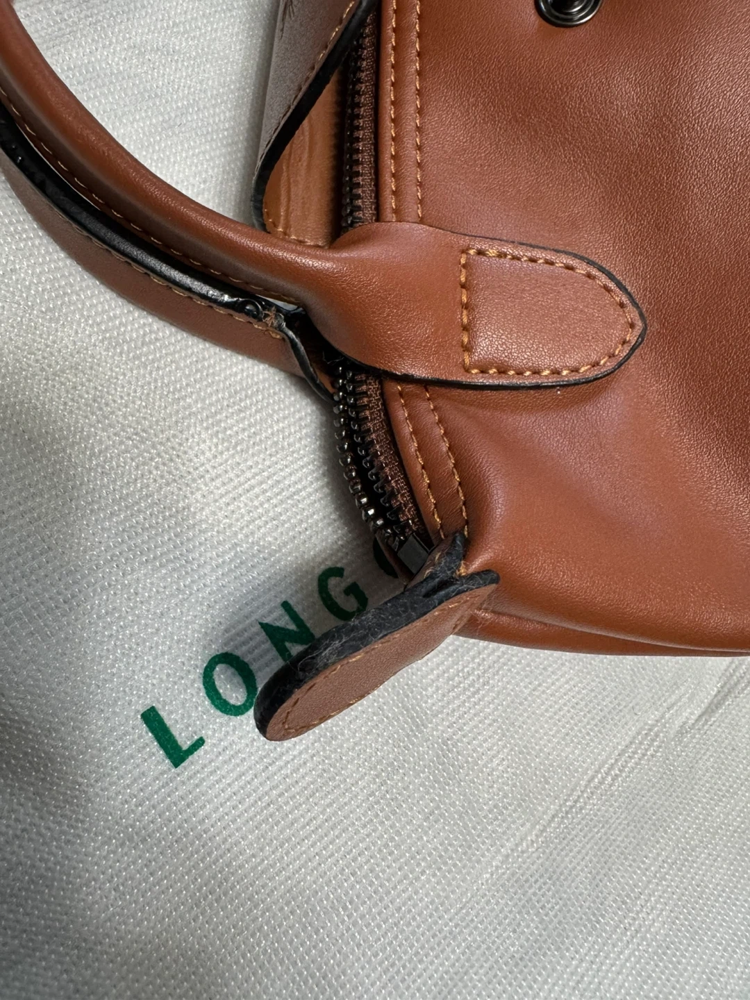 Hello, selling some of my families old/unused luxury bags. Selling a Longchamp Le Pliage Cuir mini top handle bag in a beautiful brown leather! Comes with its original dust bag and strap. Details: Bag is very good condition, soft leather no blemishes. Left corner flail has some rubbing damage. Minor not major. Second last photo* Strap has some damage along the sides as shown in last photo. *pre-owned *original retail is $705cdn *comes with dust bag