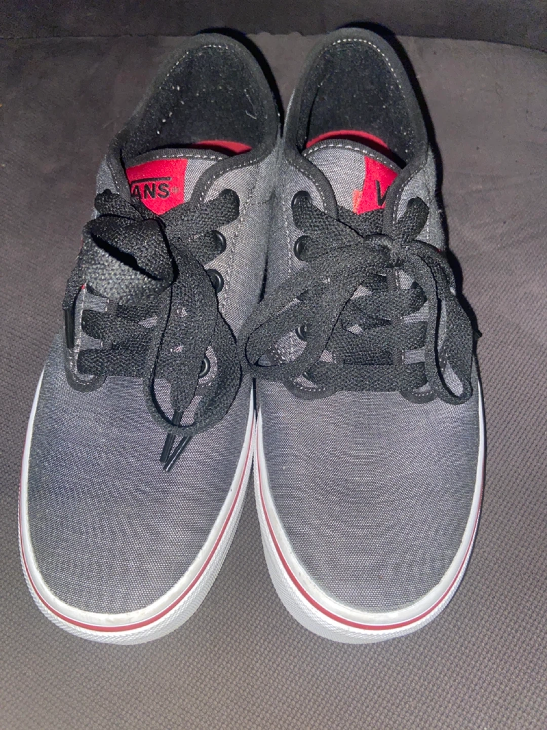 Selling a pair of Vans men's shoes in size 7.5. They're in great shape and ready for a new home! The shoes feature a stylish grey denim-like material with black laces and a white sole with a red stripe. The classic "Off The Wall" logo is on the heel