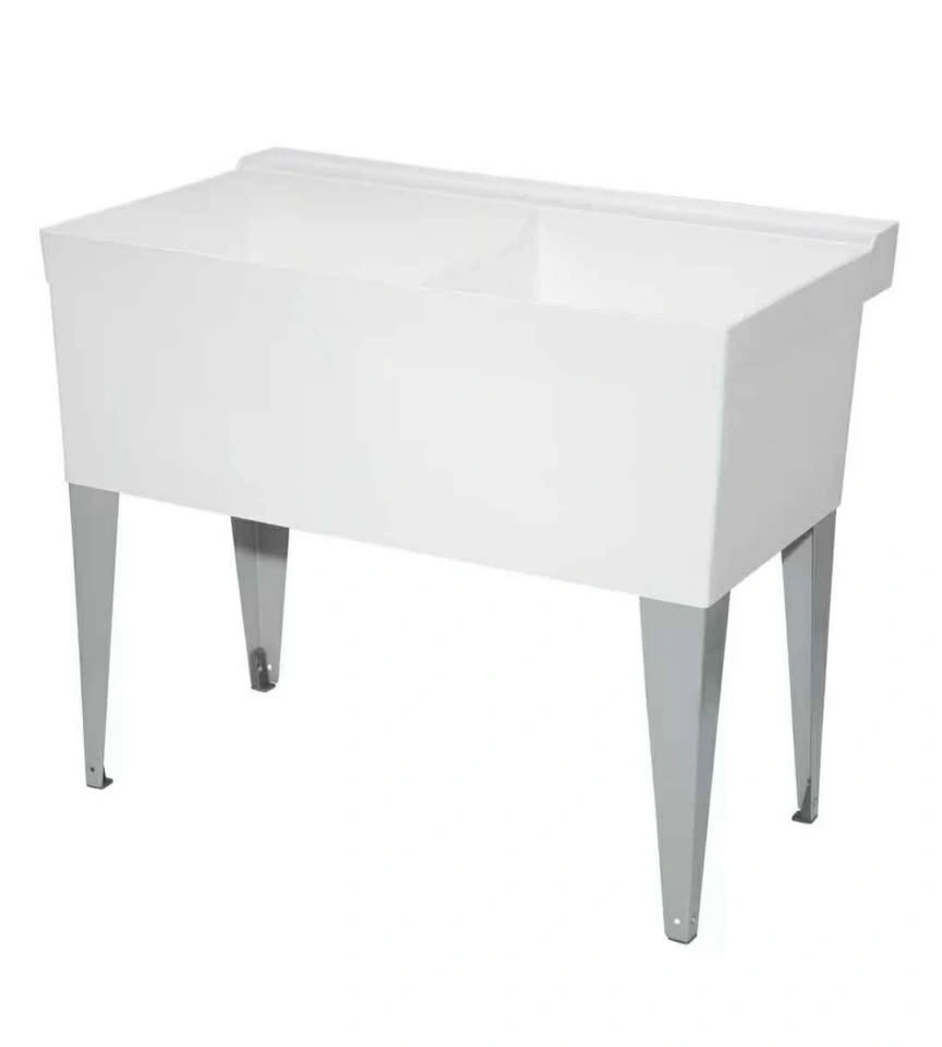 MUSTEE Utilatwin Double Laundry Tub Floor Mount 40 Inch x24 Inch BRAND NEW IN BOX $265 MODEL NUMBER 27F 3 AVAILABLE BRAND NEW IN BOX Make the most of your laundry room needs by installing the E L Mustee Tualatin 40 in. x 24 in. Structural Thermoplastic Laundry Tub. This 1-piece, moulded double tub is designed to accommodate single or dual-handle faucet with 4 in. or 8 in. centre. The tub is made of structural thermoplastic. The sink's basins are 13 in. deep and can each hold up to 19 gallons of water. This laundry tub is floor mount design. Rust- and mildew-resistant surface helps keep the tub looking like new for longer Meets CSA standards Floor-mount design utilizes heavy-gauge steel legs to support tub Comes with connecting waste assembly for 1 1/2 in. P-Trap 1-piece moulded tub made with structural thermoplastic for durability