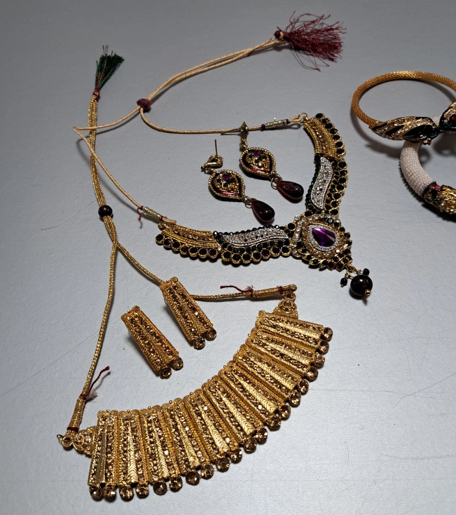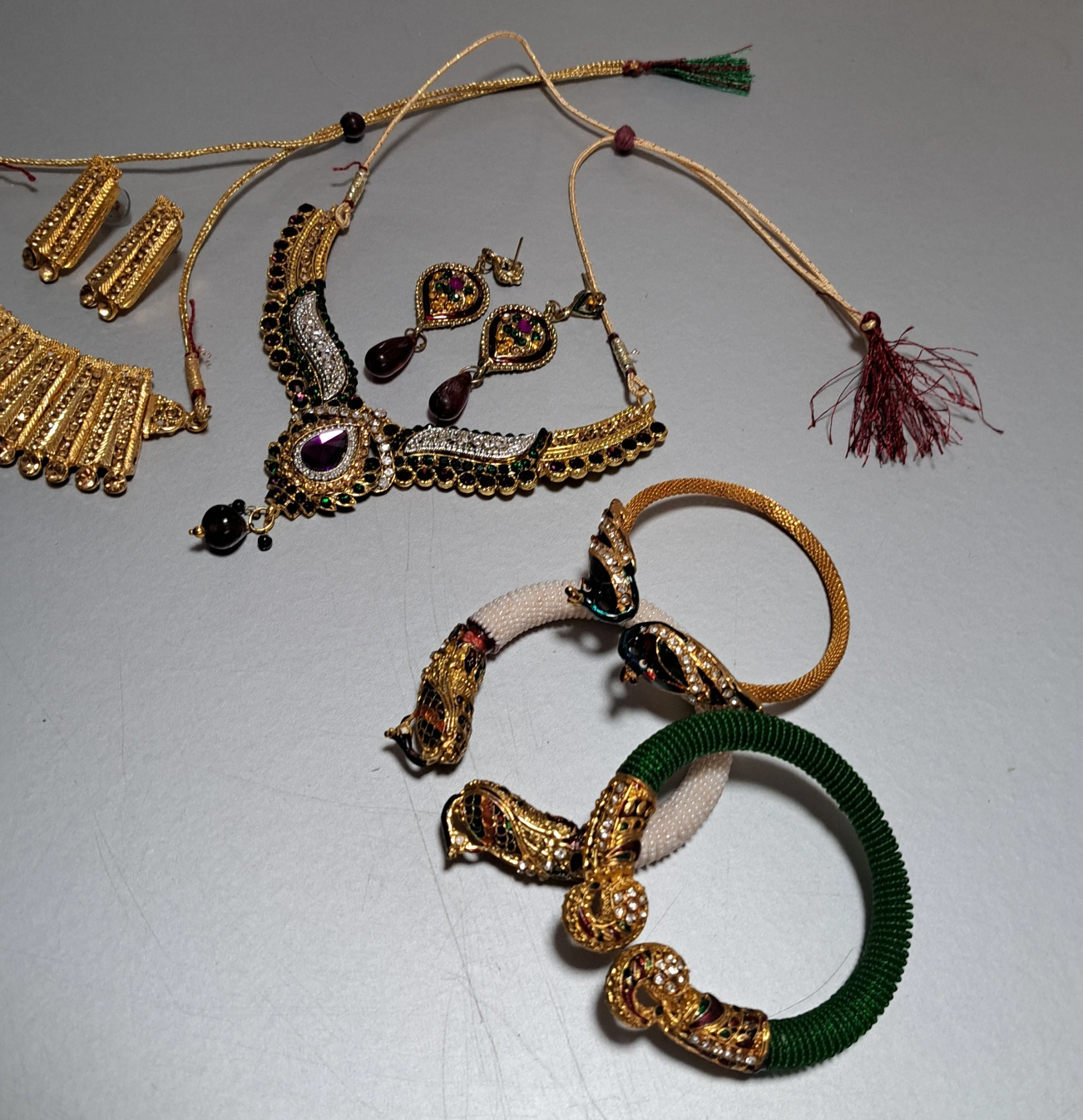 Selling a beautiful jewellery set that includes necklaces, earrings, and bangles. The set features intricate designs and gold-tone finishes, perfect for adding a touch of elegance to any outfit. BRAND NEW Each Set - $5 All Bangles - $5 EVERYTHING - $12