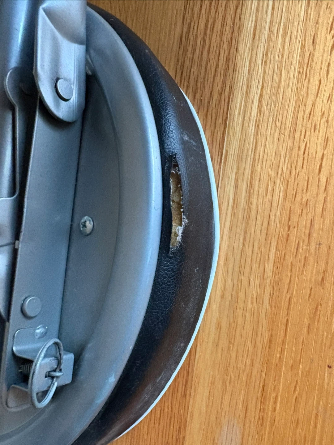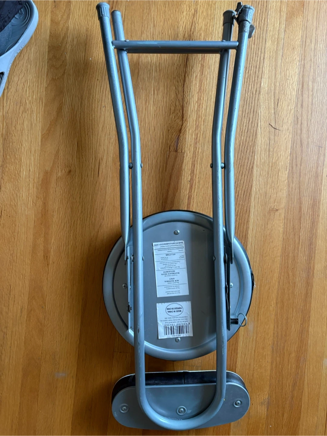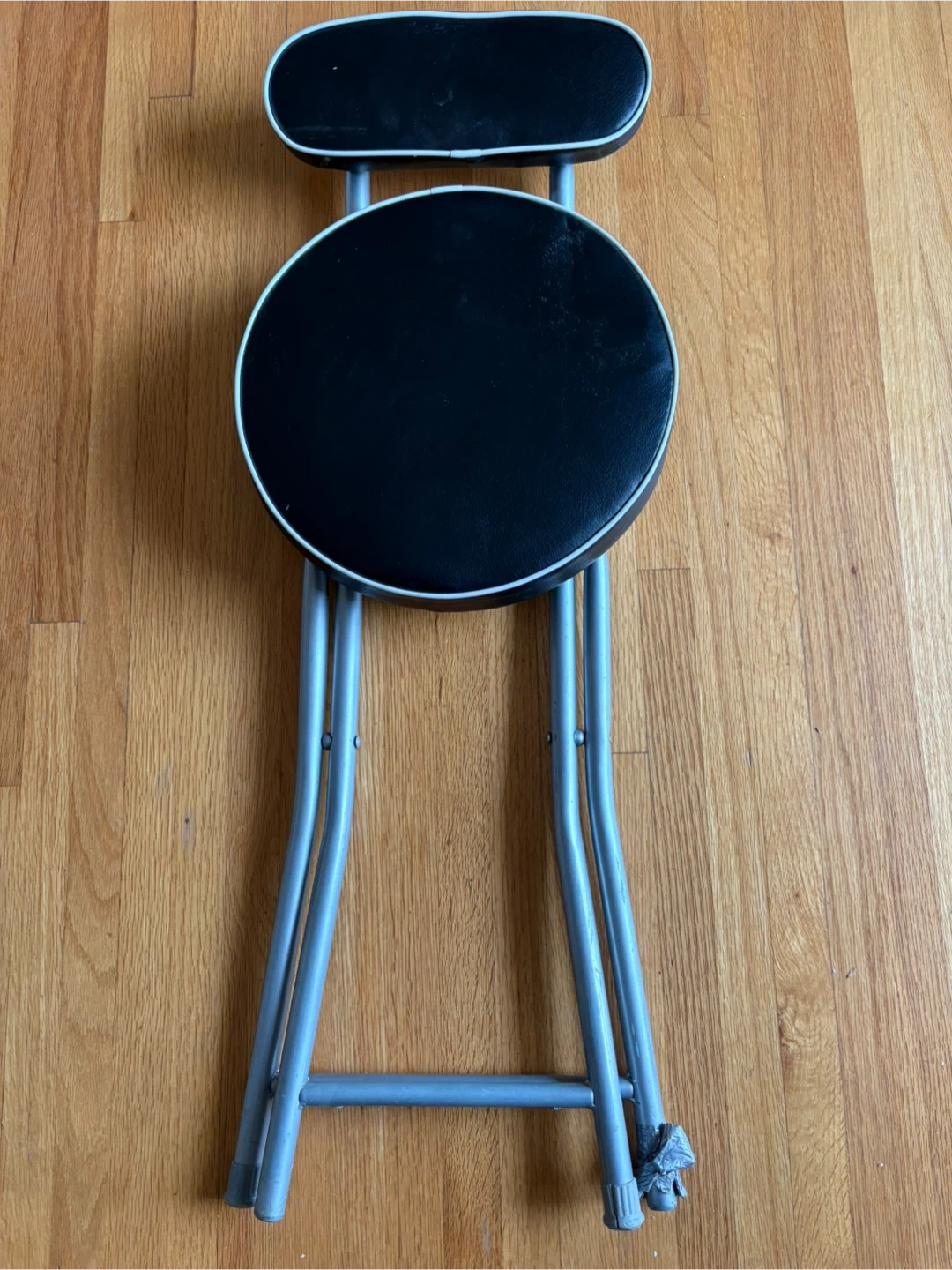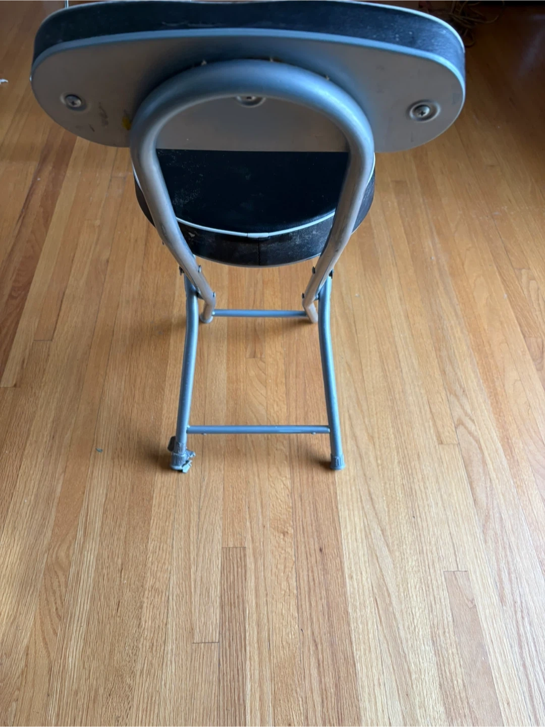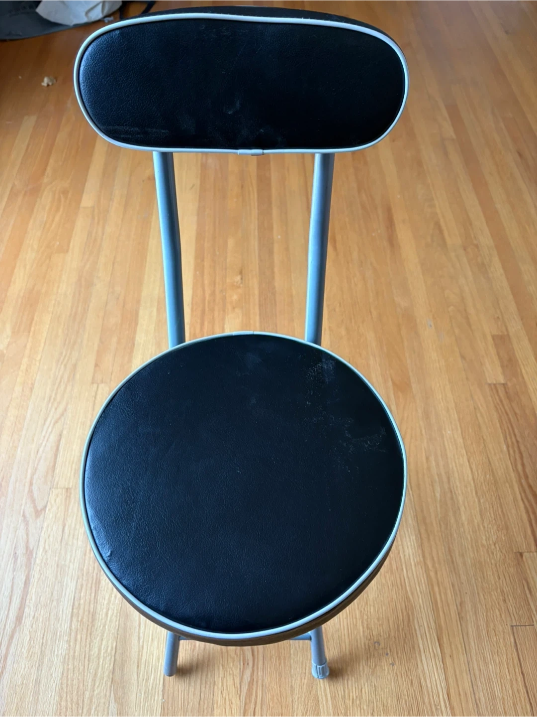 Selling a folding stool with a black vinyl seat. It's in used condition, with some wear and tear on the seat. Great for small spaces or as an extra seat when needed! Folds up easily for storage, pick up at Morley trail