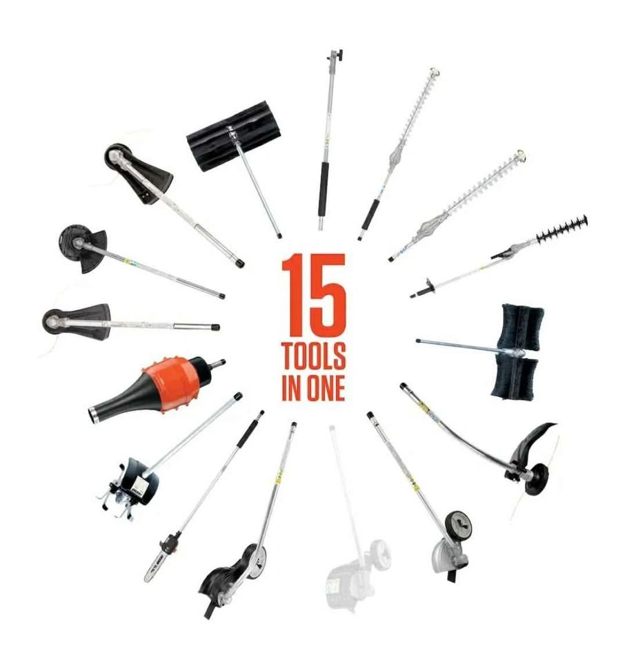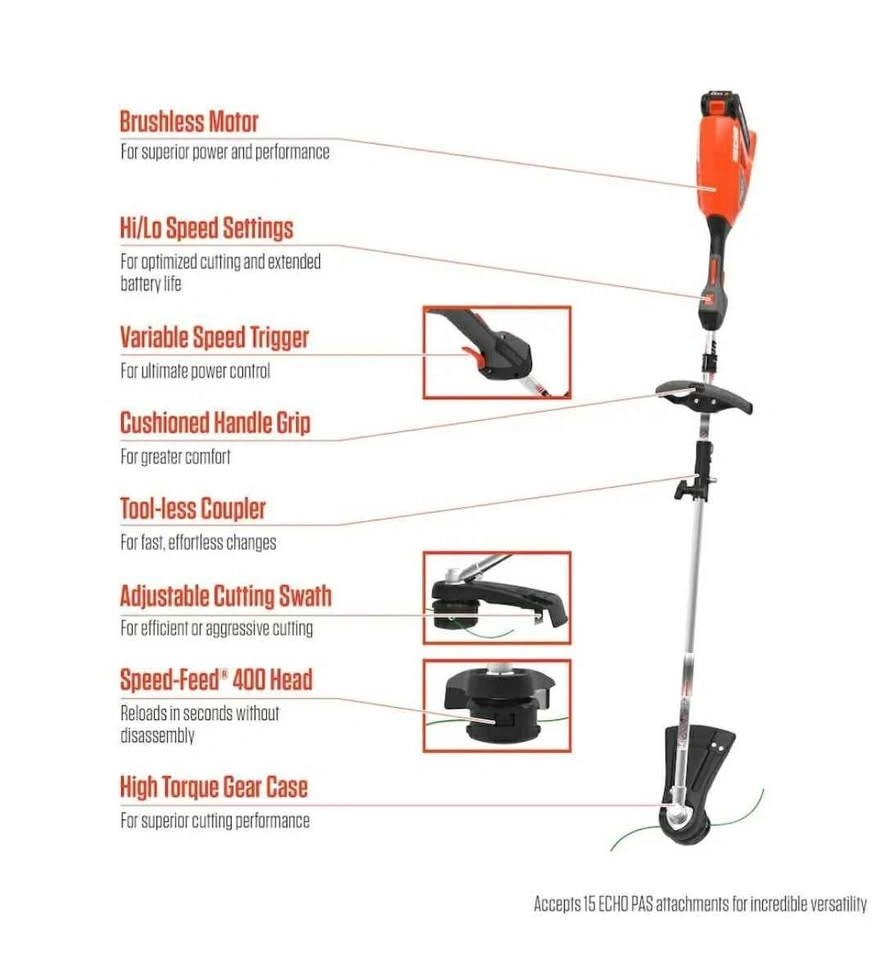 ECHO 56V eFORCE Cordless PRO Attachment Series Power Head and Trimmer with 2.5Ah Battery and Charger. BRAND NEW IN BOX $315 Model number DPAS-2100SBC1 ECHO's eFORCE DPAS-2100SB 56V split-boom string trimmer with 2.5 Ah battery and standard charger offers a versatile option for home-owners in need of a powerful and durable multi-tool. Part of ECHO's Pro Attachment Series, the DPAS-2100SB power head comes standard with the Pro Attachment Series string trimmer attachment, and can also be coupled with up to 15 total ECHO attachments, including a pole pruner, articulating hedge trimmer, blower and even a power broom. Powerful brushless motor. Hi/Lo speed settings for optimized cutting and battery life. Lightweight with cushioned handle grip for greater comfort. Adjustable 14-in or 16-in cutting swath for either efficient or aggressive cutting. Compatible with most ECHO PRO Attachment Series (PAS) Attachments and all ECHO eFORCE batteries and chargers. Includes (1) tool, (1) LBP-56V125A and (1) LC-56V2AAB.