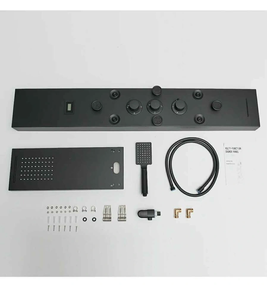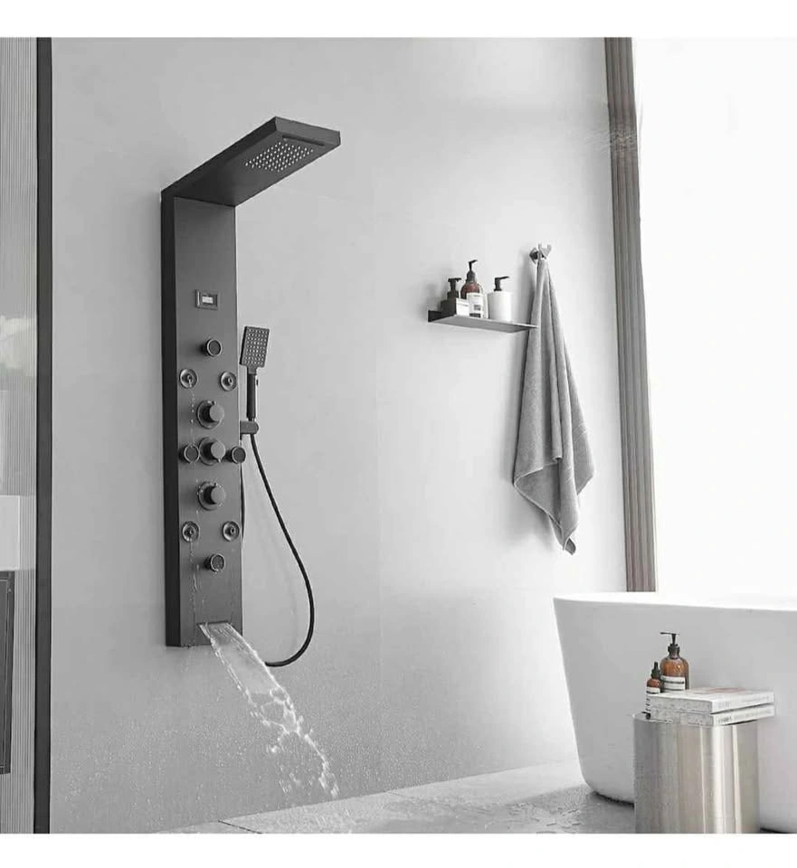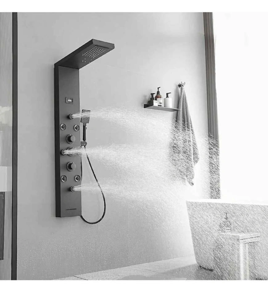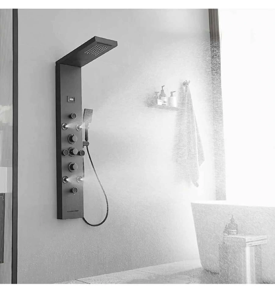 BWE 8-Jet Rainfall Shower Panel System with Rainfall Waterfall Shower Head and Shower Wand in Black BRAND NEW IN BOX $400 MODEL NUMBER YTP07-BLACK Multi Function Shower Panel System: Shower panel tower system works by Water Flow. Full body jets, rainfall shower head and temperature display, that assist you to select the best water temperature. Multi-outlet Switches which controls Multiple Combinations water effects, with Jets nozzles for Power Mist Massage and Handheld Shower Fixtures. This Split type shower panel include 6 functions: rainfall, waterfall, body Jets, handheld shower, tub spout, temperature display. Update your bathroom with the thermostatic shower panel including an adjustable rainfall showerhead, handheld showerhead, eight body nozzles and a glass shelf. Shower Panel System Material: 304 stainless steel thickened black finish, the material to prevent corrosion, brass connectors, high-End design. Shower Panel Detail: High pressure, easy to install and clean, Hot and cold water mixing, it is more convenient to you, make you fall in love with such a convenient bathing experience. Package Content: Coming with all mounting hardware. It is easy to install the shower tower even you are layman. Besides, there 2x water hoses on the back of the product with 1/2" us standard connection. Jet Spray: 8 jets are included on this panel to give you the relaxation you want when you've had a great workout and are left with sore muscles. The high pressure jets are even angle adjustable.