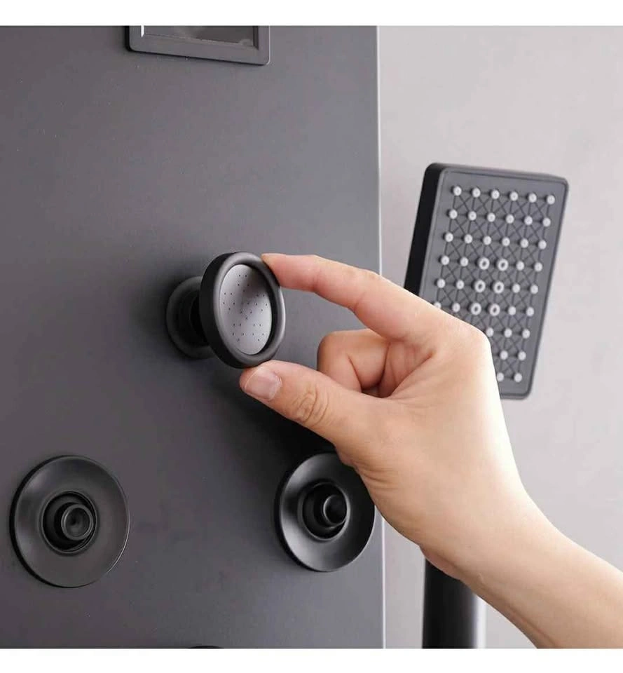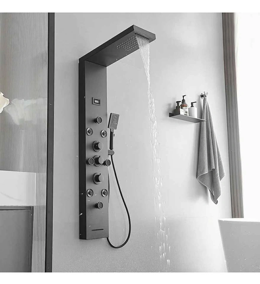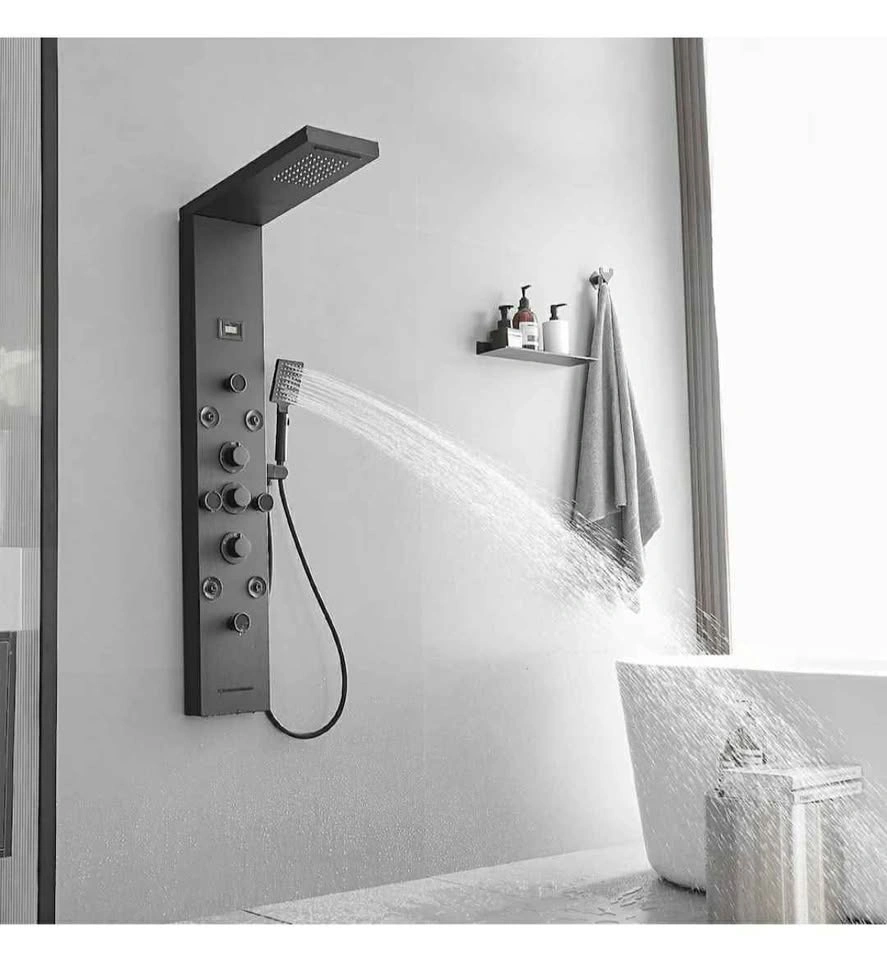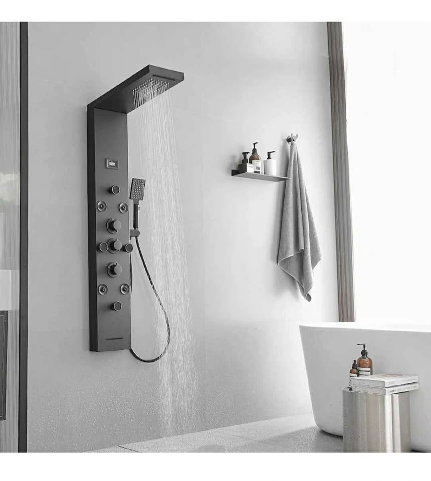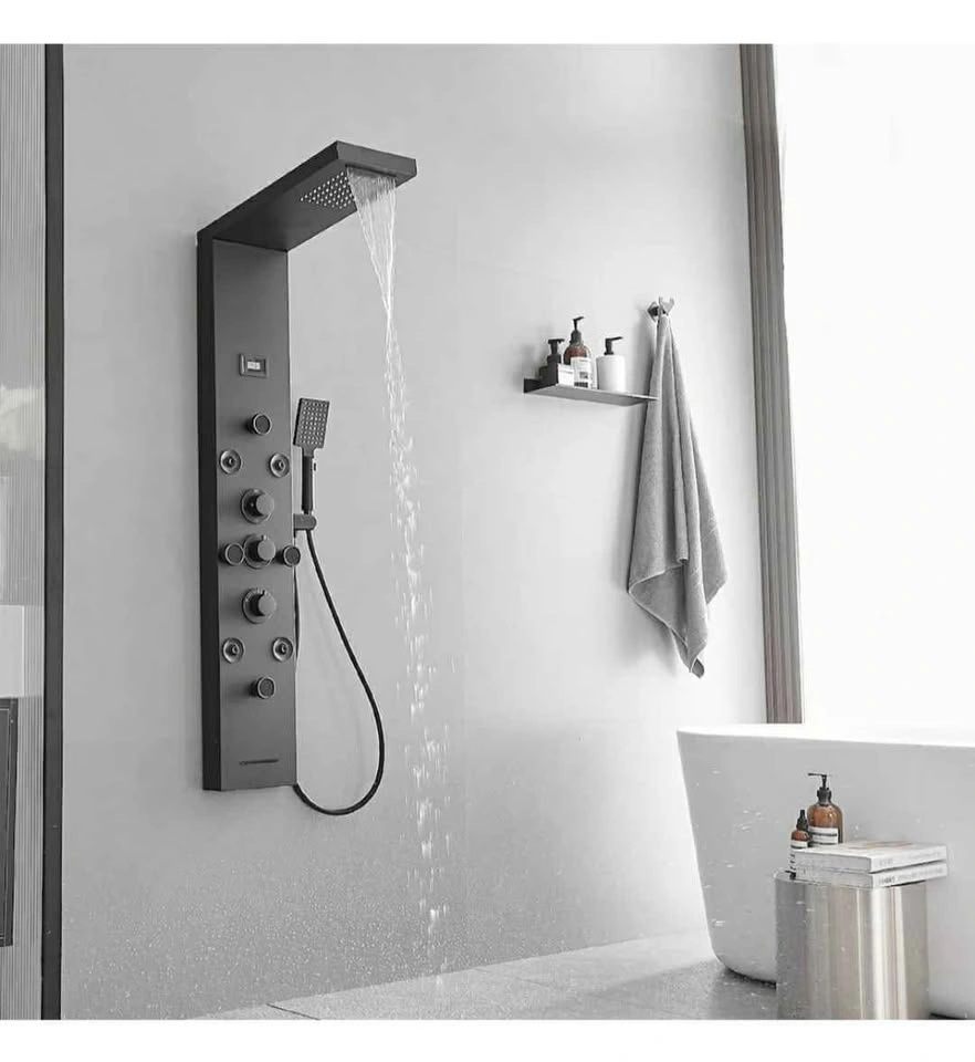 BWE 8-Jet Rainfall Shower Panel System with Rainfall Waterfall Shower Head and Shower Wand in Black BRAND NEW IN BOX $400 MODEL NUMBER YTP07-BLACK Multi Function Shower Panel System: Shower panel tower system works by Water Flow. Full body jets, rainfall shower head and temperature display, that assist you to select the best water temperature. Multi-outlet Switches which controls Multiple Combinations water effects, with Jets nozzles for Power Mist Massage and Handheld Shower Fixtures. This Split type shower panel include 6 functions: rainfall, waterfall, body Jets, handheld shower, tub spout, temperature display. Update your bathroom with the thermostatic shower panel including an adjustable rainfall showerhead, handheld showerhead, eight body nozzles and a glass shelf. Shower Panel System Material: 304 stainless steel thickened black finish, the material to prevent corrosion, brass connectors, high-End design. Shower Panel Detail: High pressure, easy to install and clean, Hot and cold water mixing, it is more convenient to you, make you fall in love with such a convenient bathing experience. Package Content: Coming with all mounting hardware. It is easy to install the shower tower even you are layman. Besides, there 2x water hoses on the back of the product with 1/2" us standard connection. Jet Spray: 8 jets are included on this panel to give you the relaxation you want when you've had a great workout and are left with sore muscles. The high pressure jets are even angle adjustable.