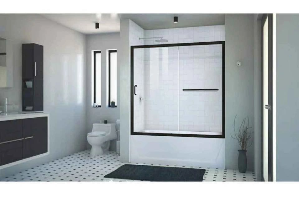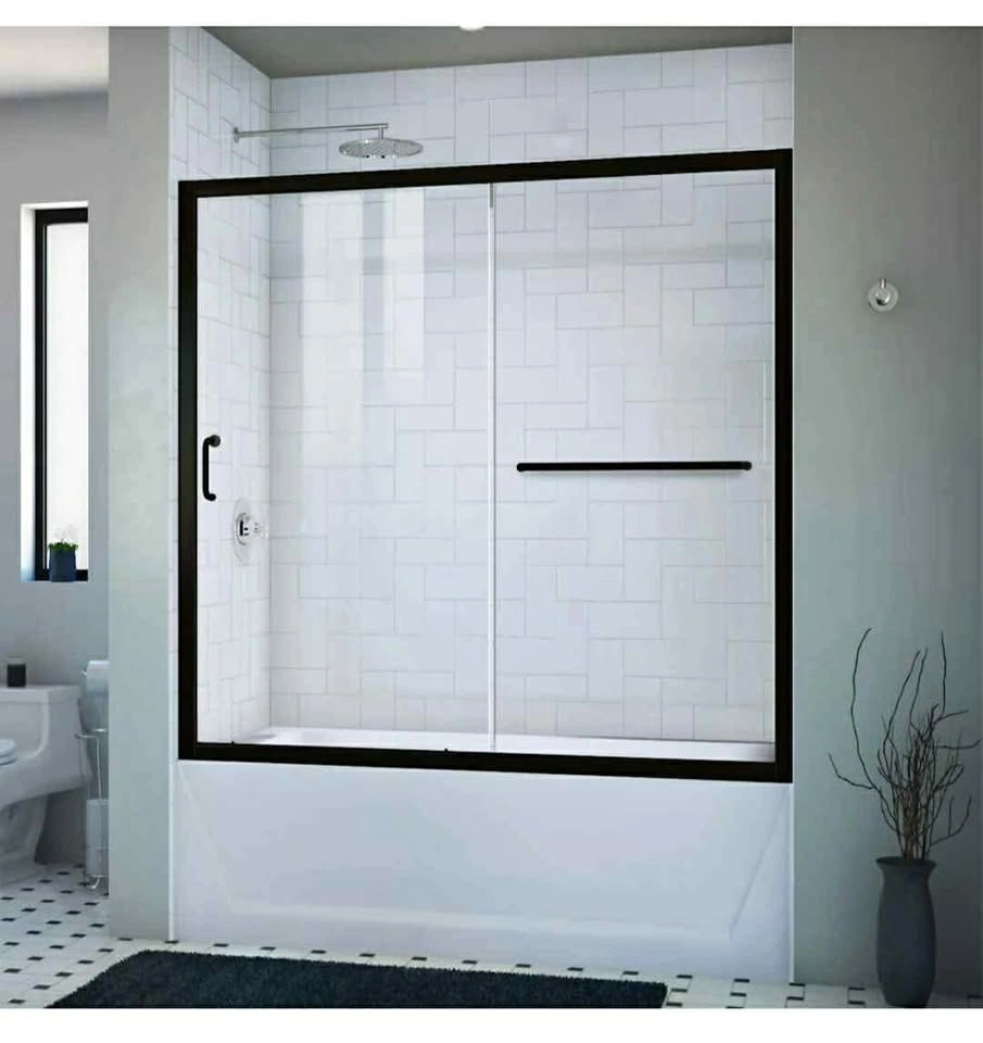 DreamLine Infinity-Z 56 to 60 in. W x 58 in. H Semi-Frameless Sliding Bathtub Door in Matte Black with Clear Tempered Glass BRAND NEW IN BOX $480 MODEL NUMBER 600037-900-340-000 The DreamLine Infinity-Z sliding shower or tub door offers classic style with a modern touch. A variety of finishes and glass options will match any bathroom decor. Model Size: 56 - 60 in. W x 58 in. H; Walk-in Opening: 21 3/8 - 25 3/8 in.; Configuration consists of a Stationary Panel and Sliding Door Quality 1/4 in. (6mm) thick Clear certified tempered glass; Reversible for a right or left door opening to fit your specific layout Up to 1 in. adjustment per side for out-of-plumb (uneven) walls; Guide rails can be trimmed up to 4 in. for width adjustment Hardware Finish: Satin Black; All measurements should be taken only AFTER walls are finished.