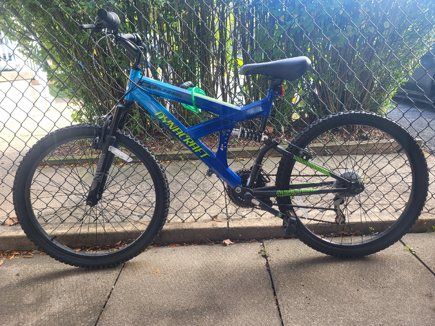 Selling a Dynacraft mountain bike in blue! It's a sturdy bike perfect for trails or just getting around town. Features Shimano components.