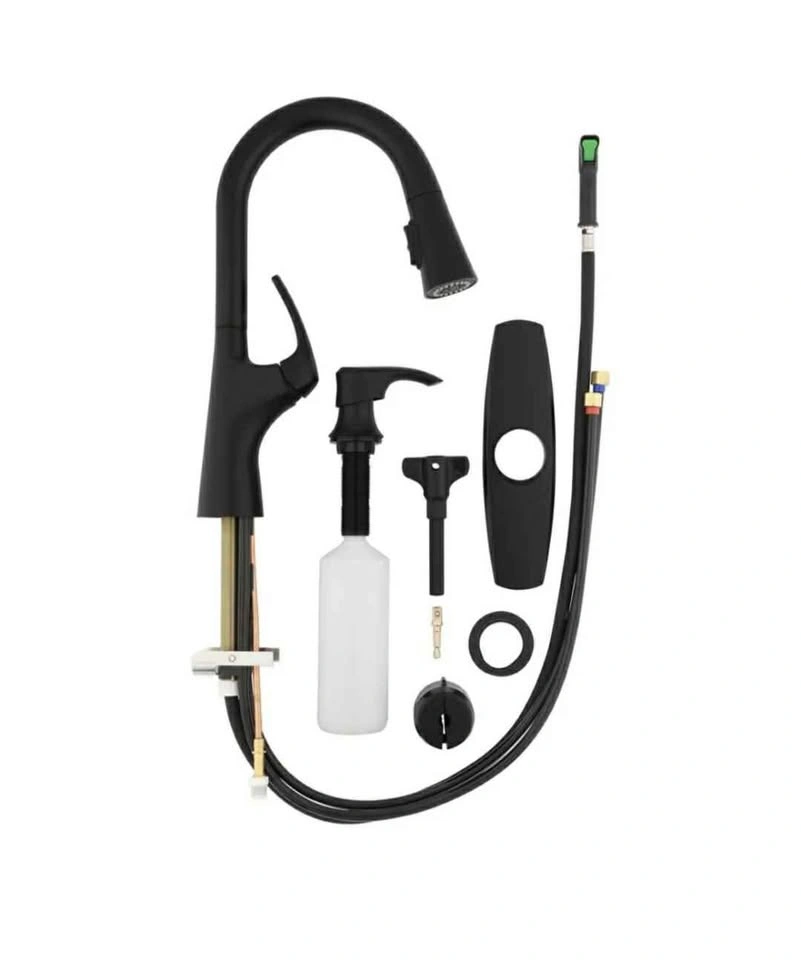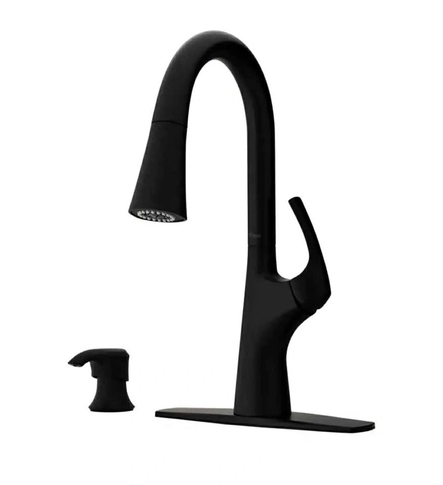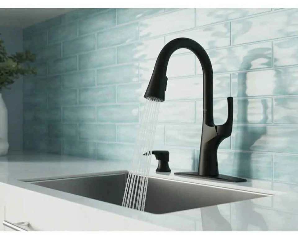 BRAND NEW IN BOX $175 MODEL NUMBER F5297SVNB Among the many reasons modern styling endures is the sense of order and uncluttered sophistication that its clean lines impart on a space. What better room for that than your kitchen? Seahaven is a softer take on traditional mid-century design, featuring a cohesive handle and pull-down spray head that cues both simplicity and strength. A modern showpiece that's as appealing as it is precise, Seahaven is available in Matte Black, Spot Defense Stainless Steel and Polished Chrome. Kitchen Sink Faucet with Pull Down Sprayer and Soap Dispenser High arc kitchen faucet with a 2-function pull down spray head (spray and stream), 360 swivel spout, soap dispenser; 1 to 4-hole, 1.8 GPM Includes - polyethylene nylon braided hose, 36" integrated PE-RT supply lines with 3/8" female fittings and optional deckplate TopPfit - Install your kitchen faucet from above the sink in minutes! Simply twist the TopPfit tool to raise the below-sink swivel bracket for a quick and secure fit. Less hassle, less anger, no yoga poses. No More Leaks and No Putty Needed Features "Pforever Seal" advanced ceramic disc valve technology that will never leak, as well as "TiteSeal" Mounting Technology which simplifies installation and eliminates the need for putty or silicone MagnePfit Technology - Features powerful magnets that keep your spray head firmly secured Includes SoloTilt Sink Soap Dispenser - Features a forward tilting pump head that lets you dispense soap with the flick of your thumb Water-efficient Rated to meet or exceed CALGreen criteria, which helps to conserve water in the average home by at least 20 percent