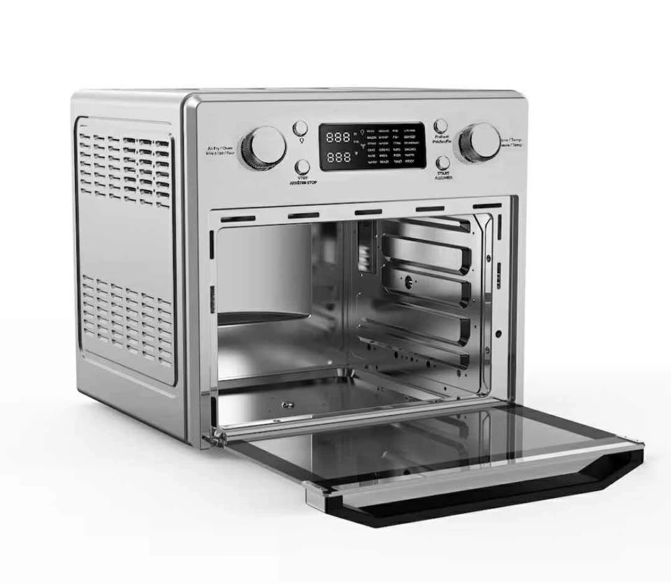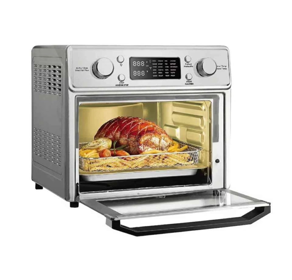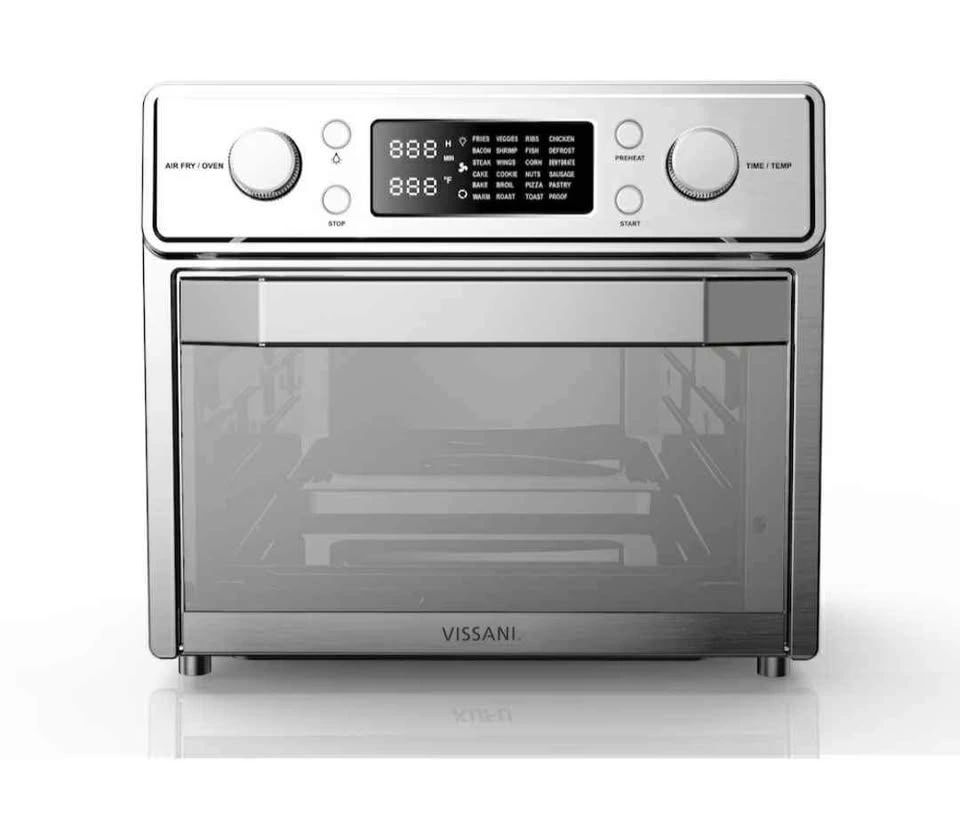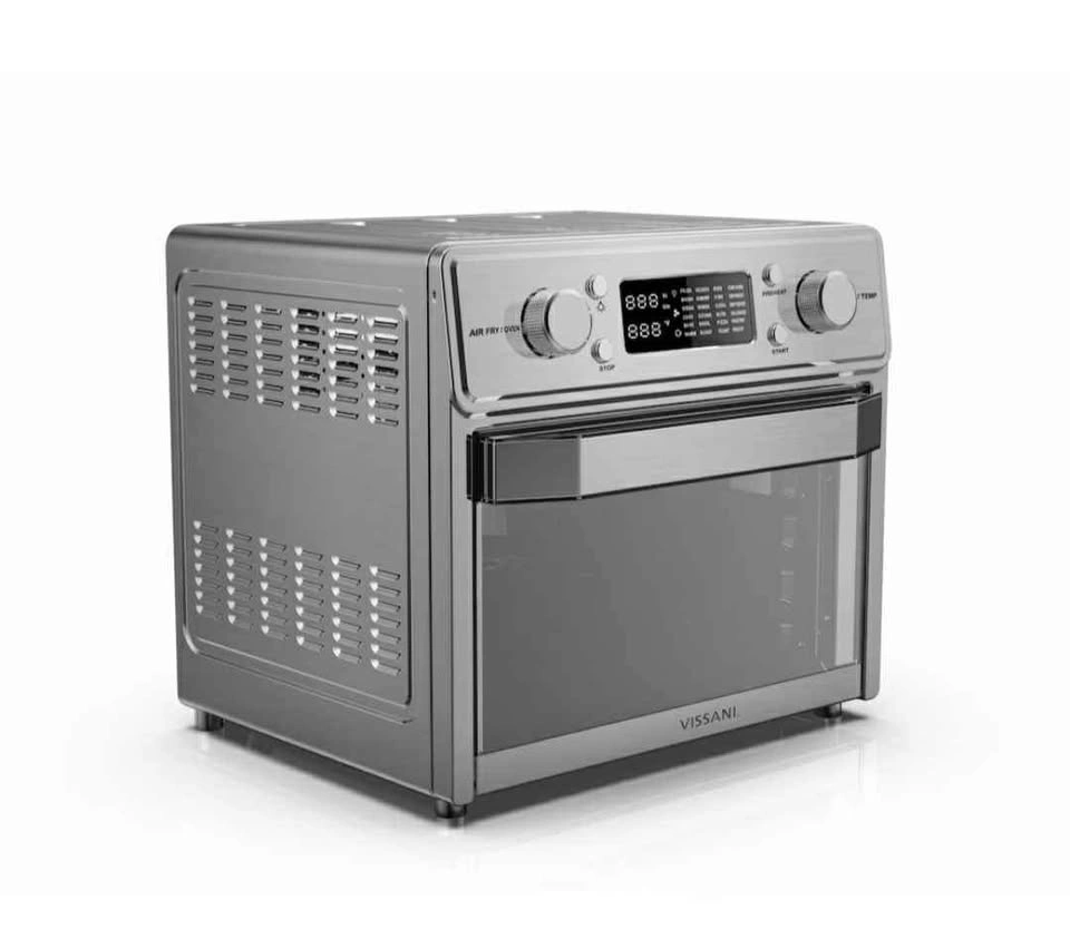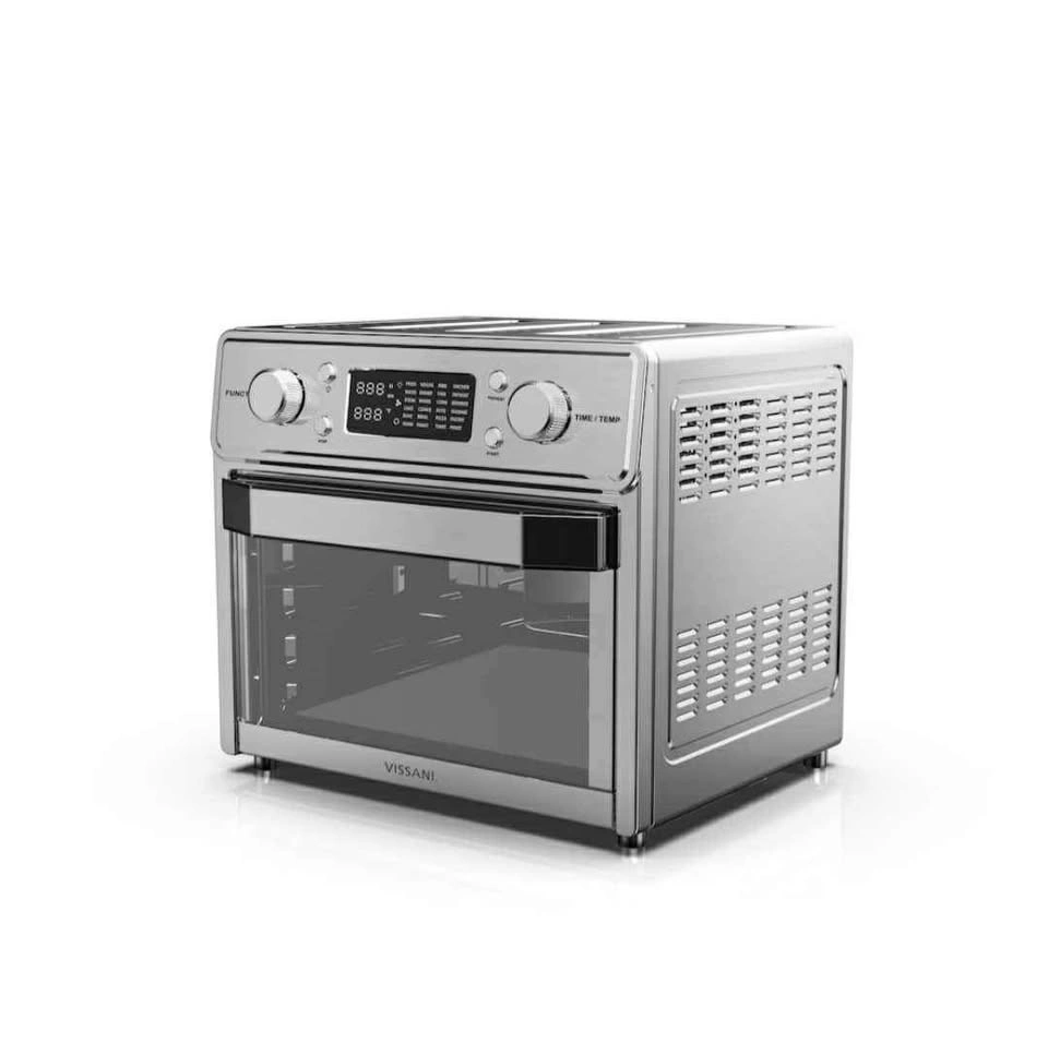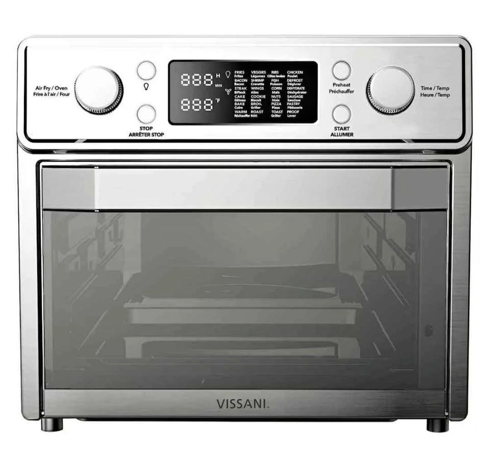 Vissani 25L Digital Air Fryer Oven with 4 Accessories, Stainless Steel. Brand new in box $80 5 units available brand new in box! The Vissani Digital Air Fryer Oven has an extra large capacity of 25 litres. The stainless steel oven has a large LED digital screen, easy one-touch control panel preset cooking programs. This air fryer oven combo offers a wide range of toaster oven functions including bake, broil, pizza, roast, toast, bagel, reheat, warm and dual cook. The air fry function and presets take the guesswork out of frying wings, fries, nuggets, snacks and veggies. 24 Preset options Easy one touch controls and 90 minute timer 25 Litre capacity Interior Light Includes: Air Fryer Mesh Basket, Crumb Tray, Wire Rack & Oil Tray Important notice - Keep the rear, top and sides of unit a minimum of 4 inches/10cm away from adjacent surfaces