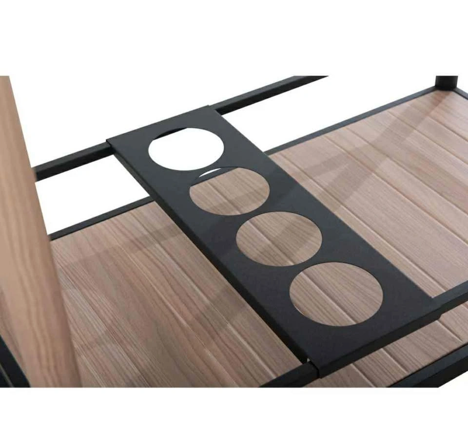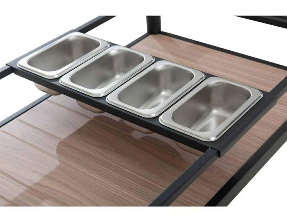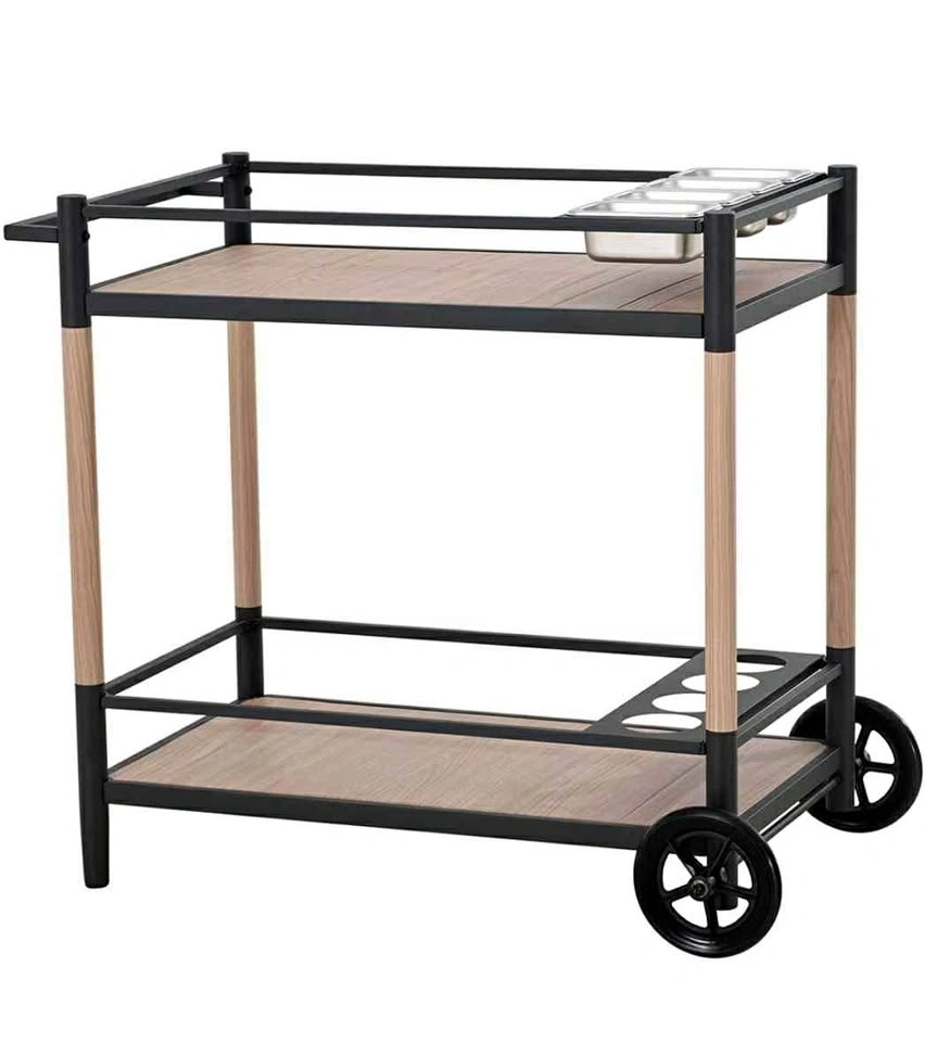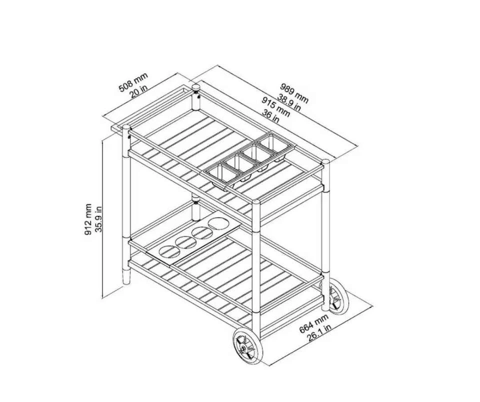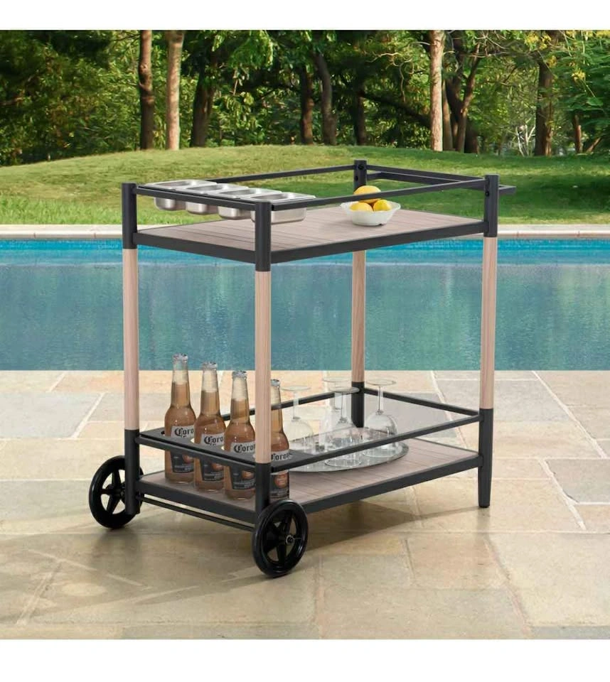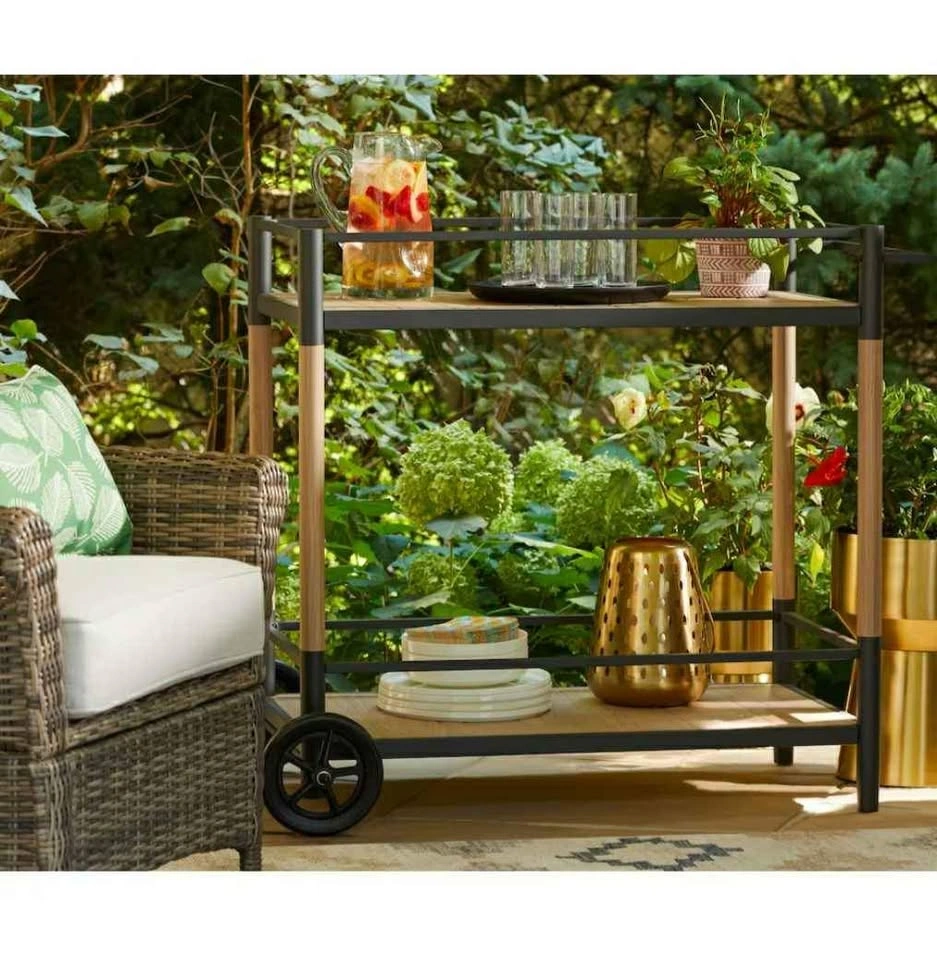 Hampton Bay Montrose Stationary Patio Bar Cart in Brown. BRAND NEW IN BOX $95 MODEL NUMBER A217000801 Montrose Brown Stationary Patio Bar Cart is perfect for your garden, kitchen and other places. On the tabletop, you can place some of your decors and necessaries. Some of your sundries can be placed on the shelf. Equipped with two rubber rolling casters, the cart is easy to move and protect the floor from scratching. The whole frame is constructed of strong steel to ensure stableness and sturdiness. Designed in concise and rustic style. Decorative cart with black finish with wood grain accents. Rust-resistant, powder-coated steel frame. Assembled dimension: 41.2-inch W x 26.5-inch D x 36-inch H. Heavy duty steel construction with 2 wheels for mobility. 2 shelves and 4 containers for serving and storage. Includes holders for bottle storage. For indoor and outdoor use.