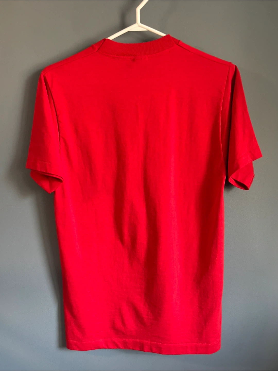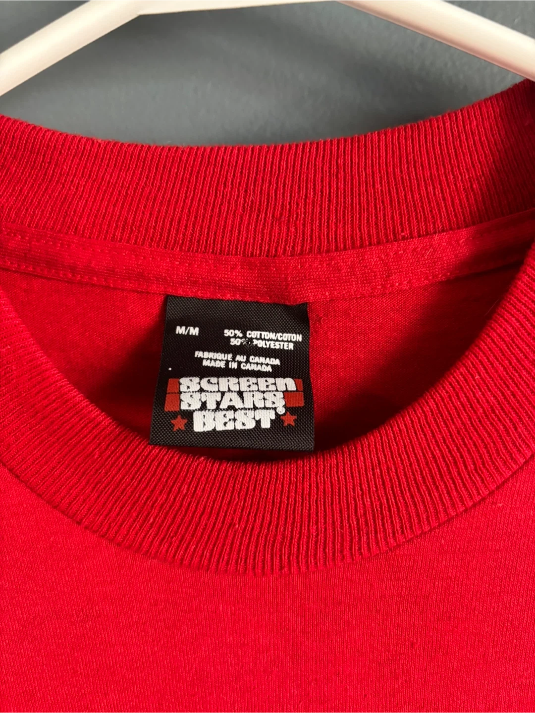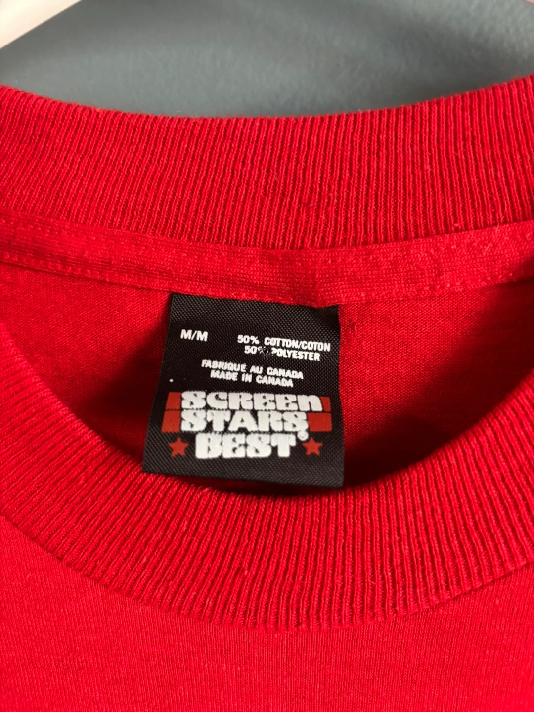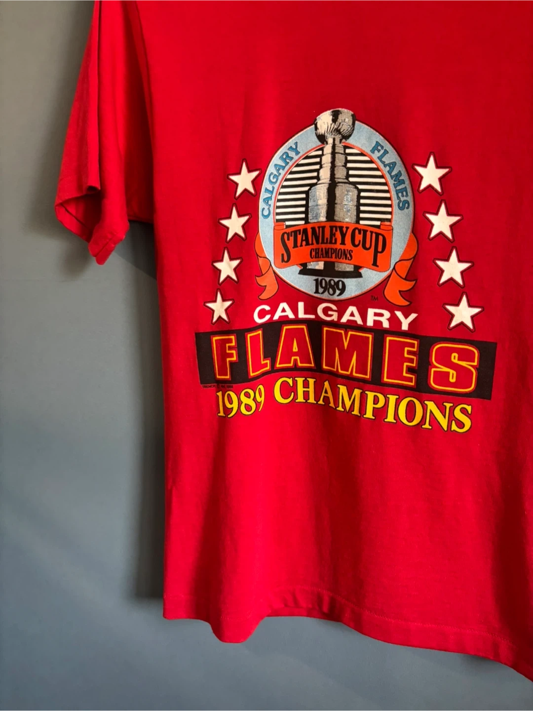 Selling a vintage Calgary Flames 1989 Stanley Cup Champions t-shirt! It's a vibrant red and in great condition. The size is M/M, and it's made from 50% cotton and 50% polyester. A perfect piece for any Flames fan!