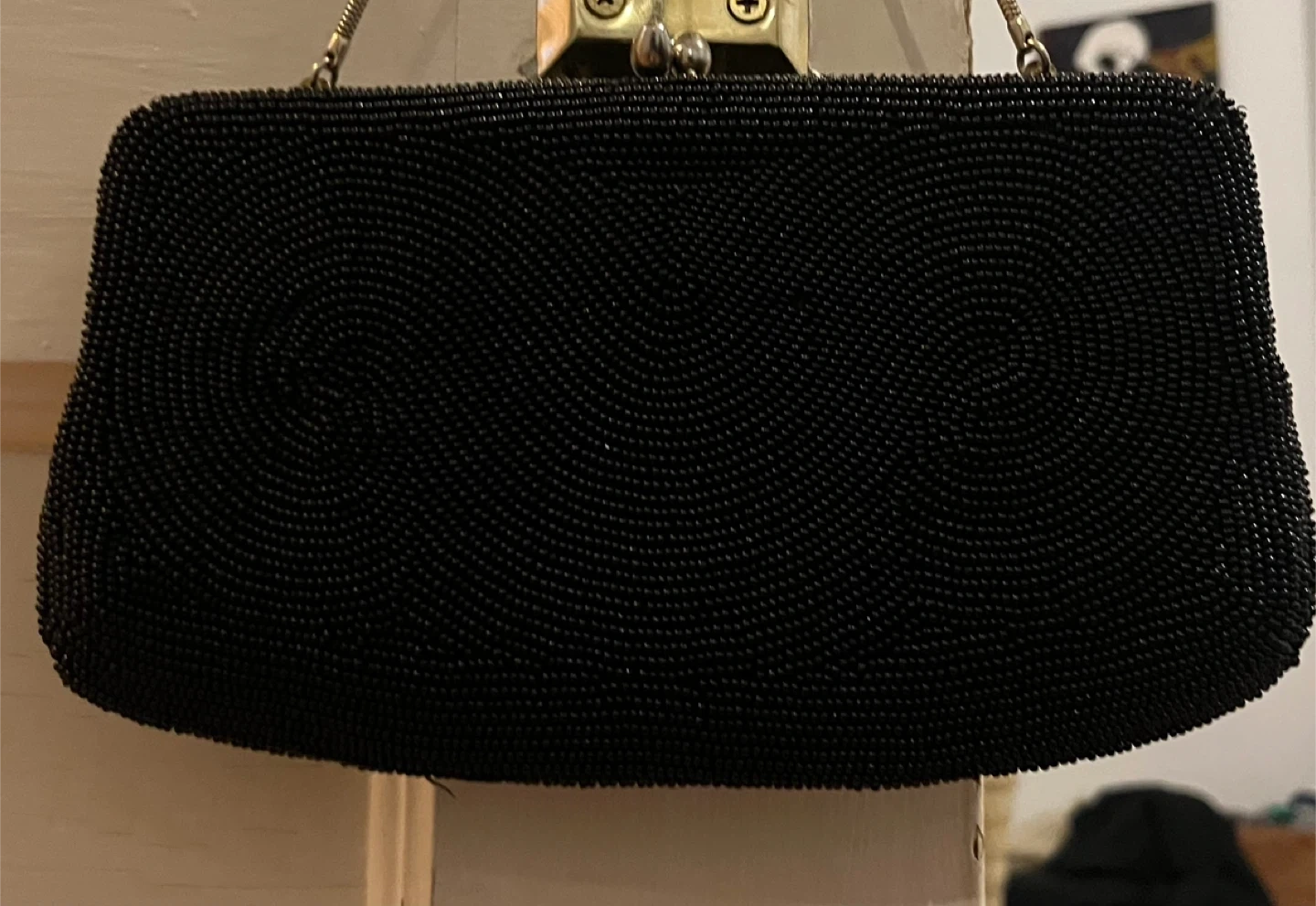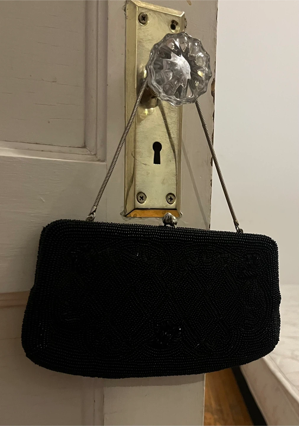 VTG Beads and Sequins Clutch Black W/ Silver Hide Away Chain Amazing condition was told late 50’s no label to tell where or who made it Cash only please
