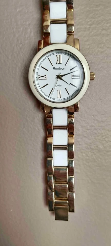 Armitron is a leading watch brand in the United States. This is a beautiful, feminine gold and white watch. Never used as you can see in the pictures, I am not a watch person. Just needs a battery change. No box. Pick up rockyridge NW.