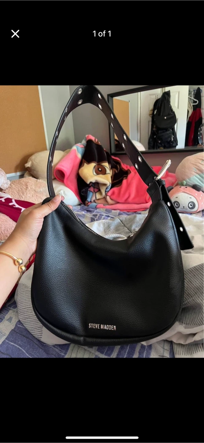 Selling a stylish black hobo bag from Steve Madden! It's in great condition and perfect for everyday use. The bag features a comfortable shoulder strap with eyelet detailing and a sleek design that complements any outfit. It's a great addition to your wardrobe