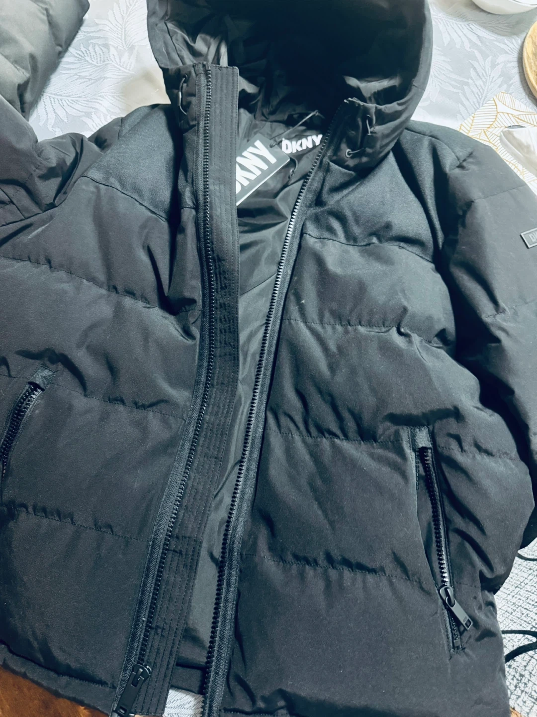 Here's a DKNY puffer jacket in black. It's in great condition and ready to keep you warm this winter! It features a hood and zippered pockets.