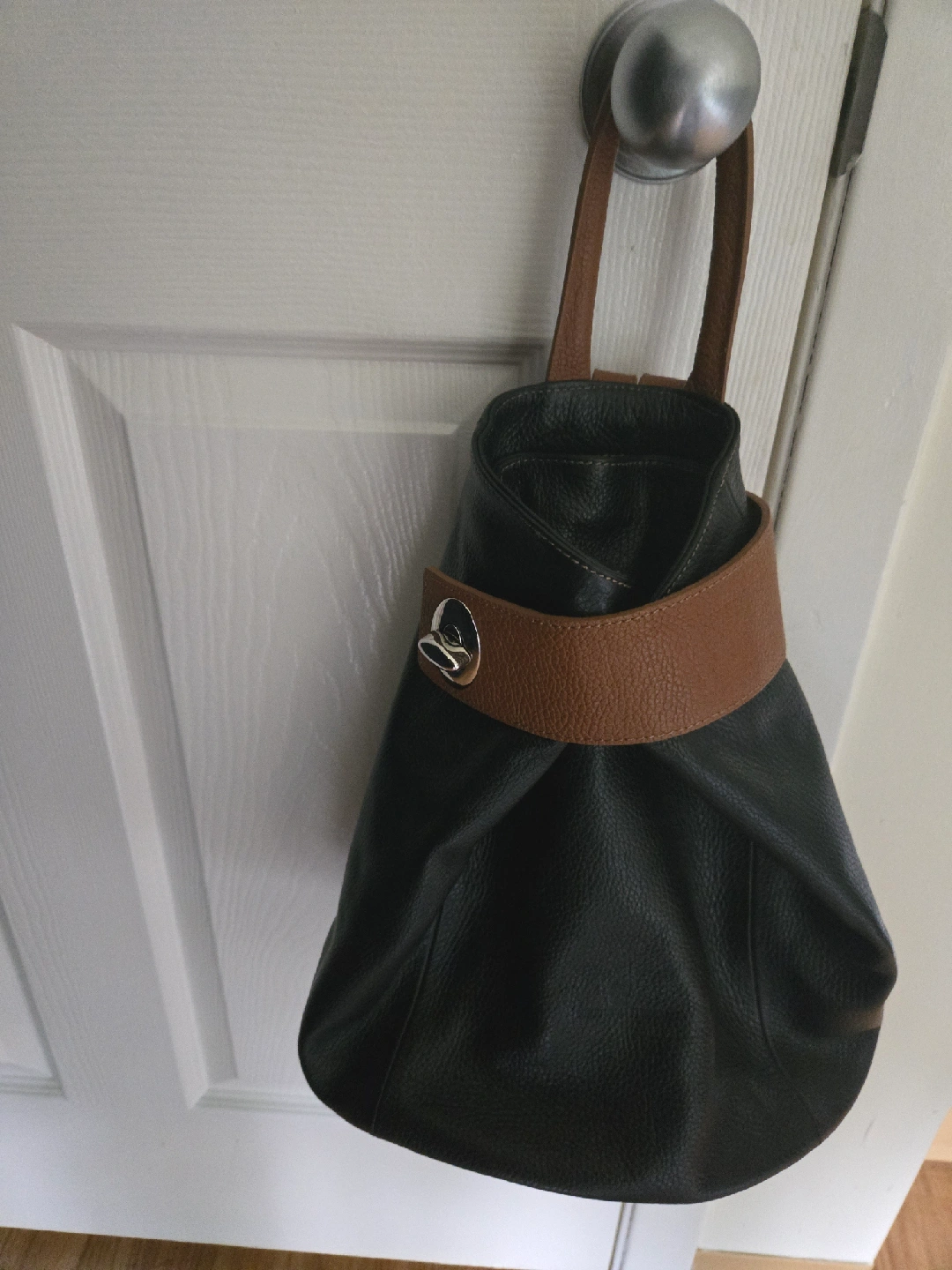 A stylish leather backpack purse in black with brown accents. It's in great condition and ready for a new home! Perfect for everyday use or a night out