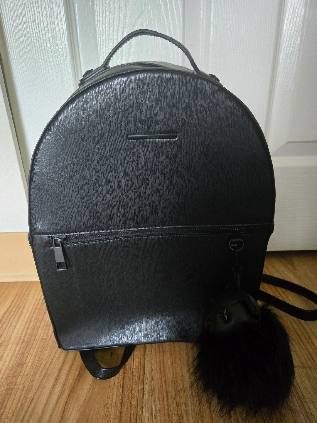 Selling a stylish black backpack! It features a unique round shape and a sleek design. It's in great condition and ready for a new owner