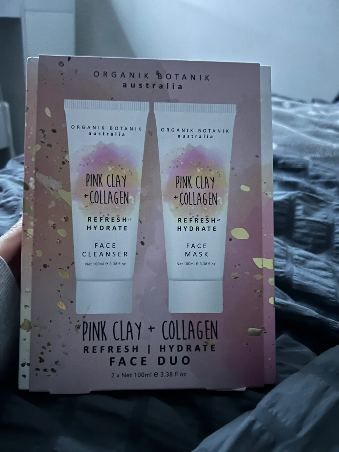 Selling an Organik Botanik Australia Pink Clay + Collagen Refresh Hydrate Face Duo! It includes a face cleanser and face mask, each 100ml/3.38 fl oz.