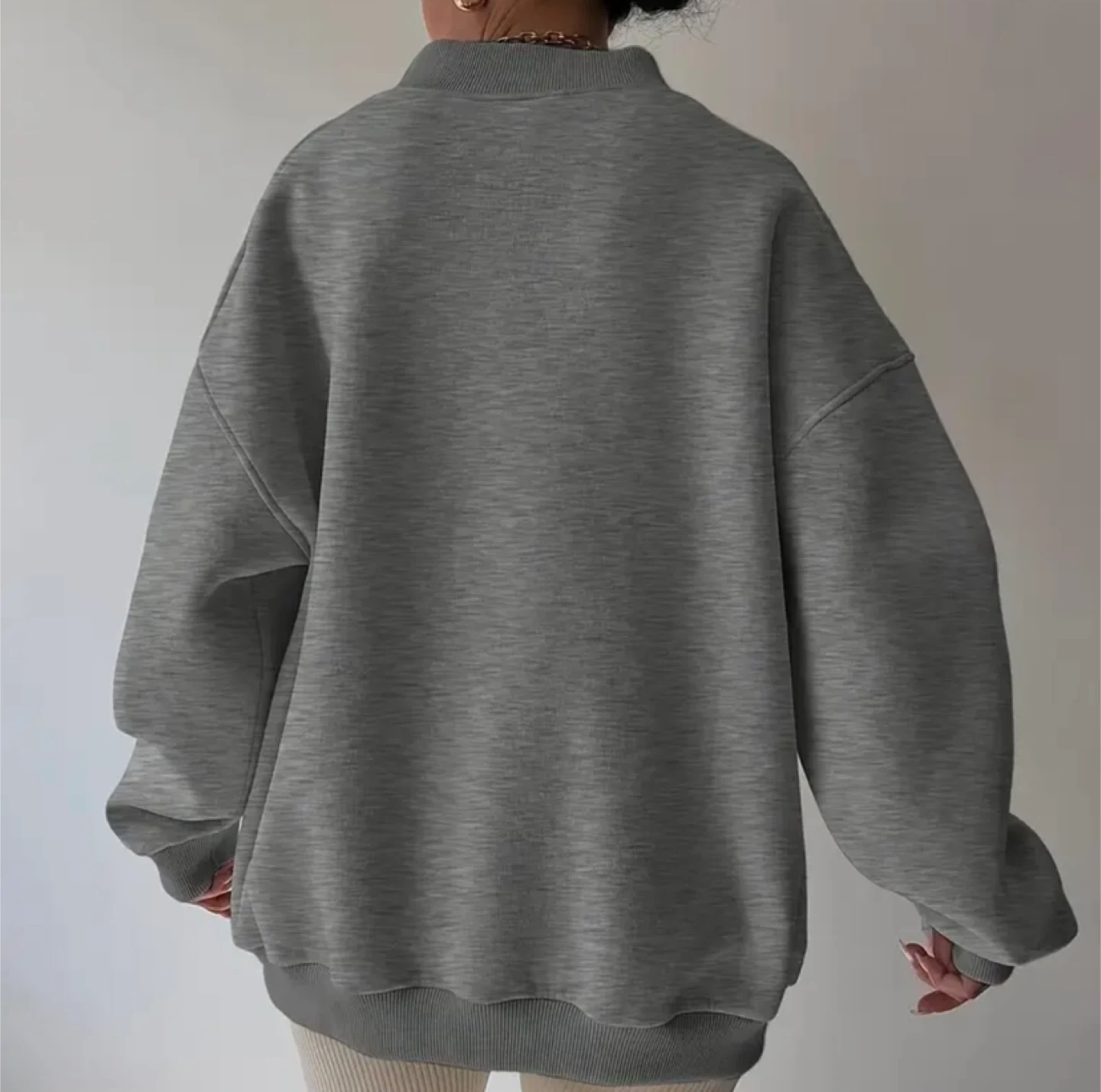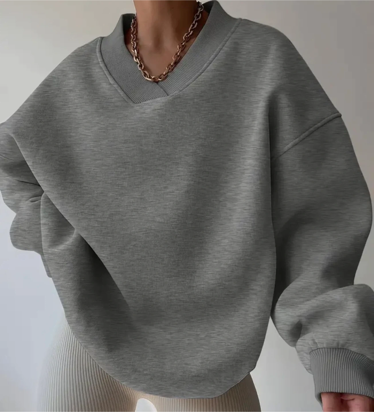 Selling a comfy, oversized V-neck sweatshirt in a neutral gray color. It's perfect for lounging around the house or running errands. The material is soft and cozy, making it ideal for cooler weather. It's in great condition and ready for a new home!