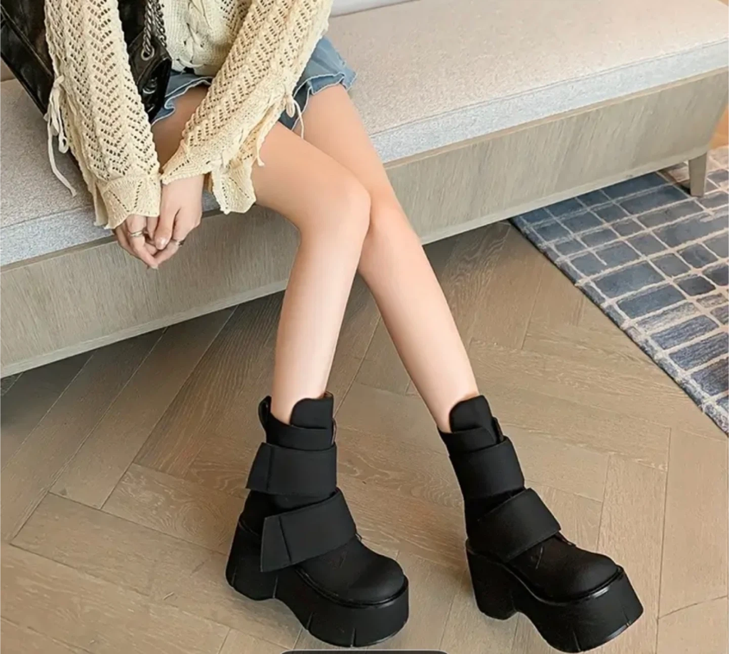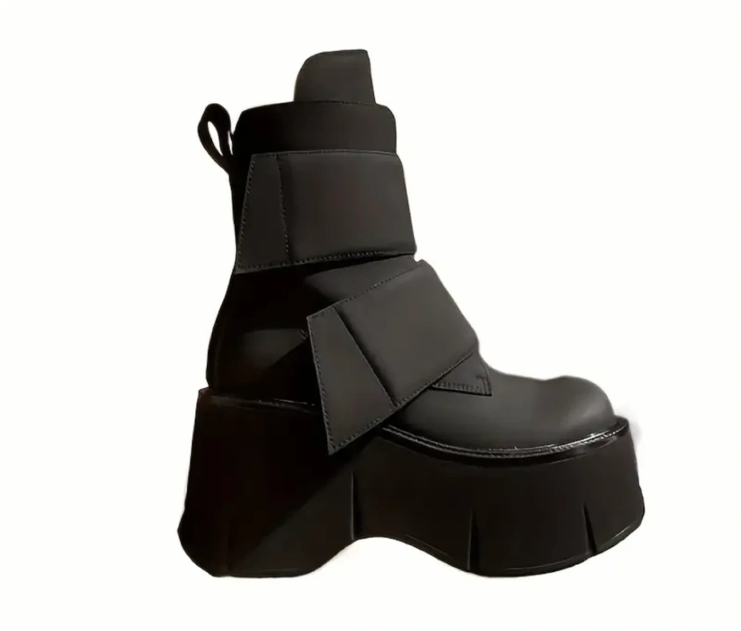 These black platform ankle boots are sure to make a statement! They feature a unique design with a thick platform sole and a padded upper. They're in great condition and ready for a new home