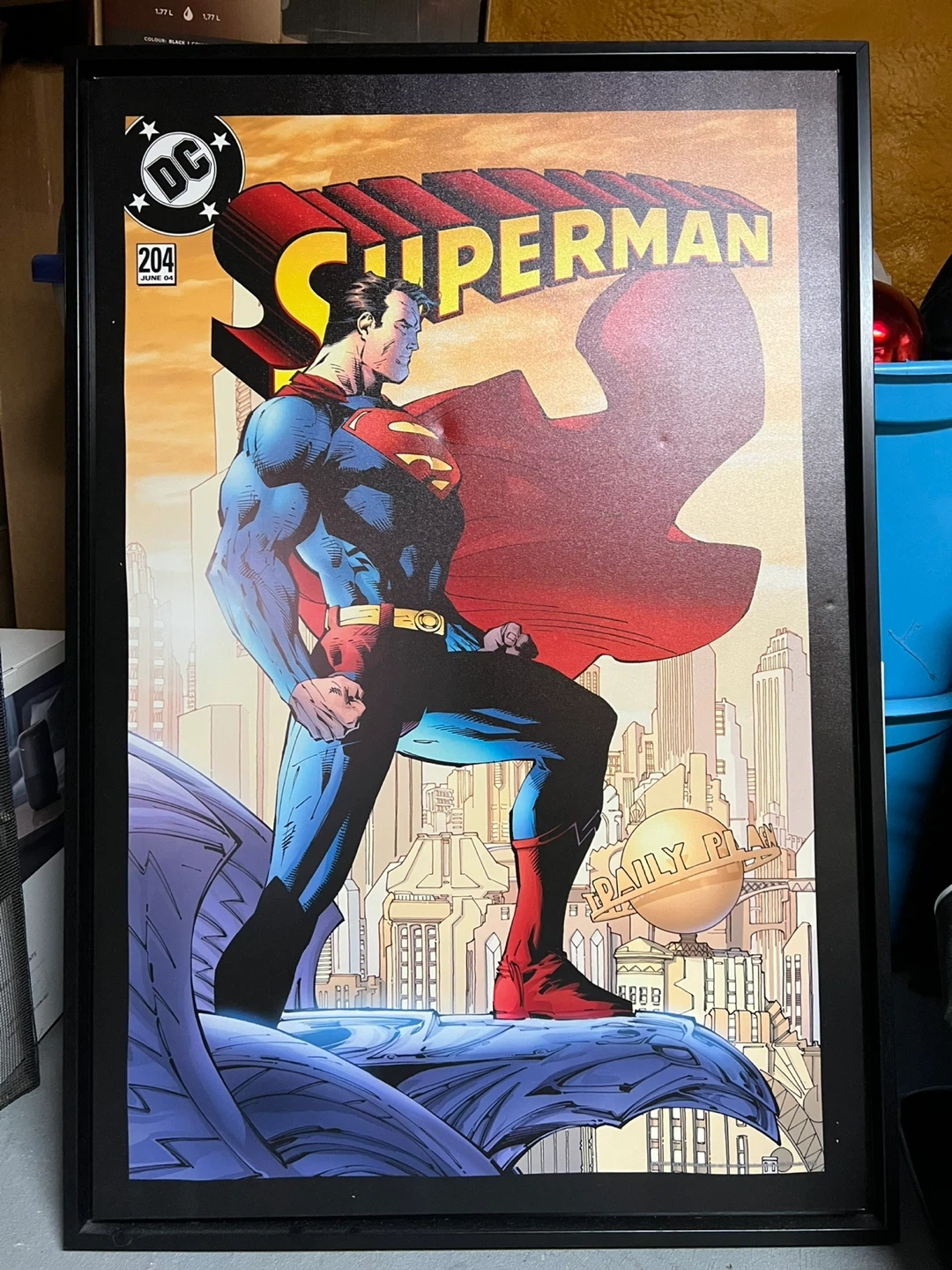 Selling a framed Superman comic book cover. It features Superman standing above the Daily Planet building. The frame is black and in good condition! Ready to hang
