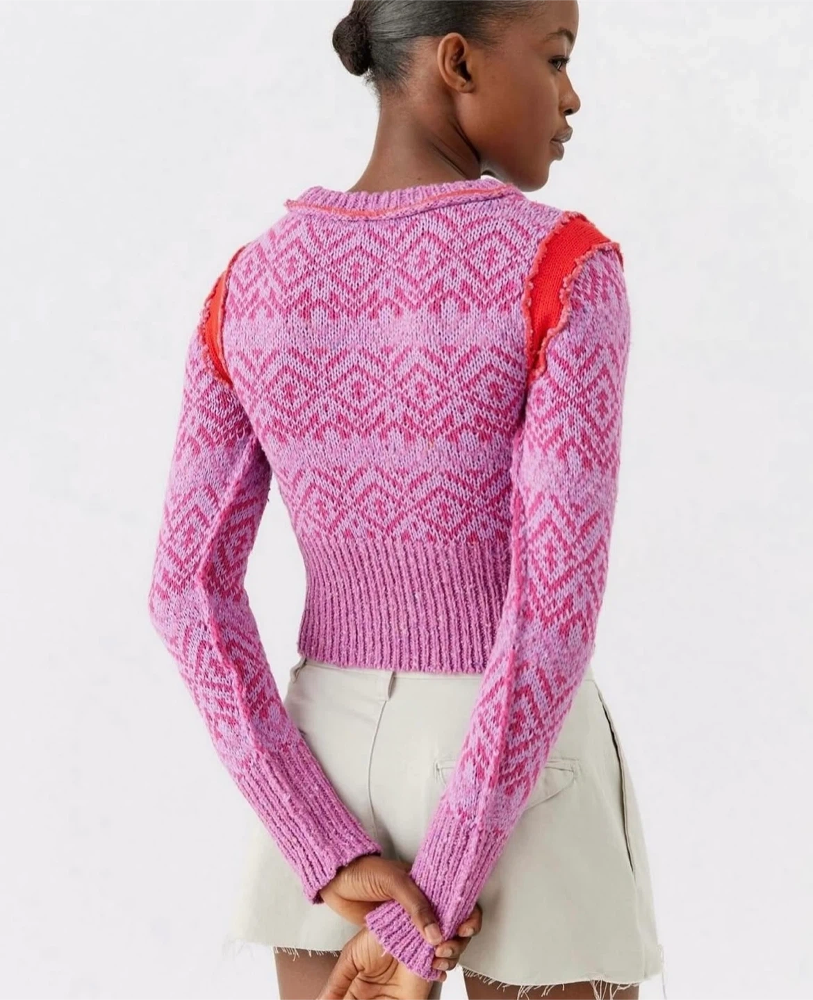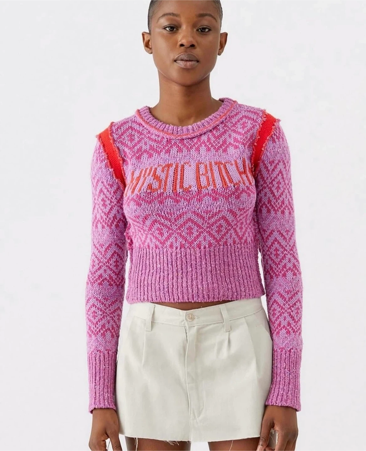 Selling a cute Urban Outfitters Mystic City sweater! It features a unique pink and red pattern. Perfect for adding a pop of colour to your wardrobe and staying cozy on chilly days