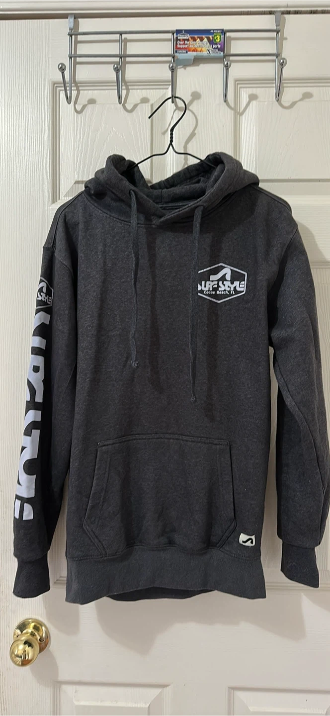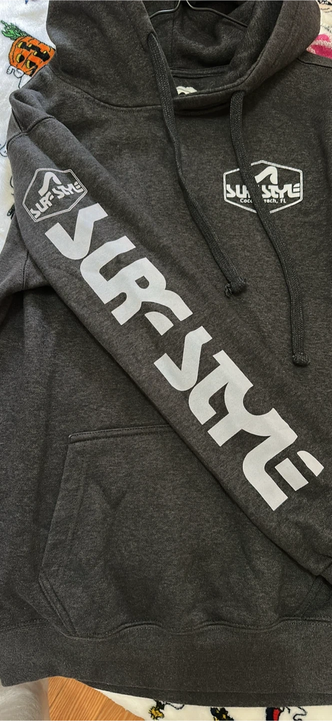 Selling a Surf Style hoodie in grey! It features the brand's logo on the front and down the sleeve. Great for casual wear or layering on cooler days