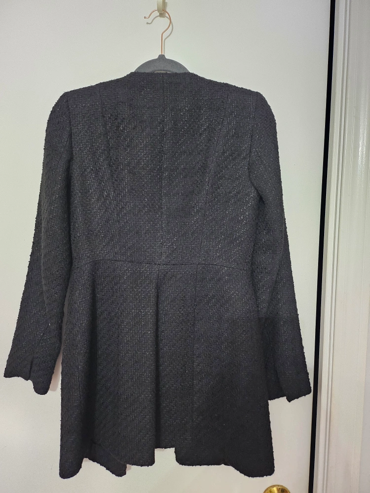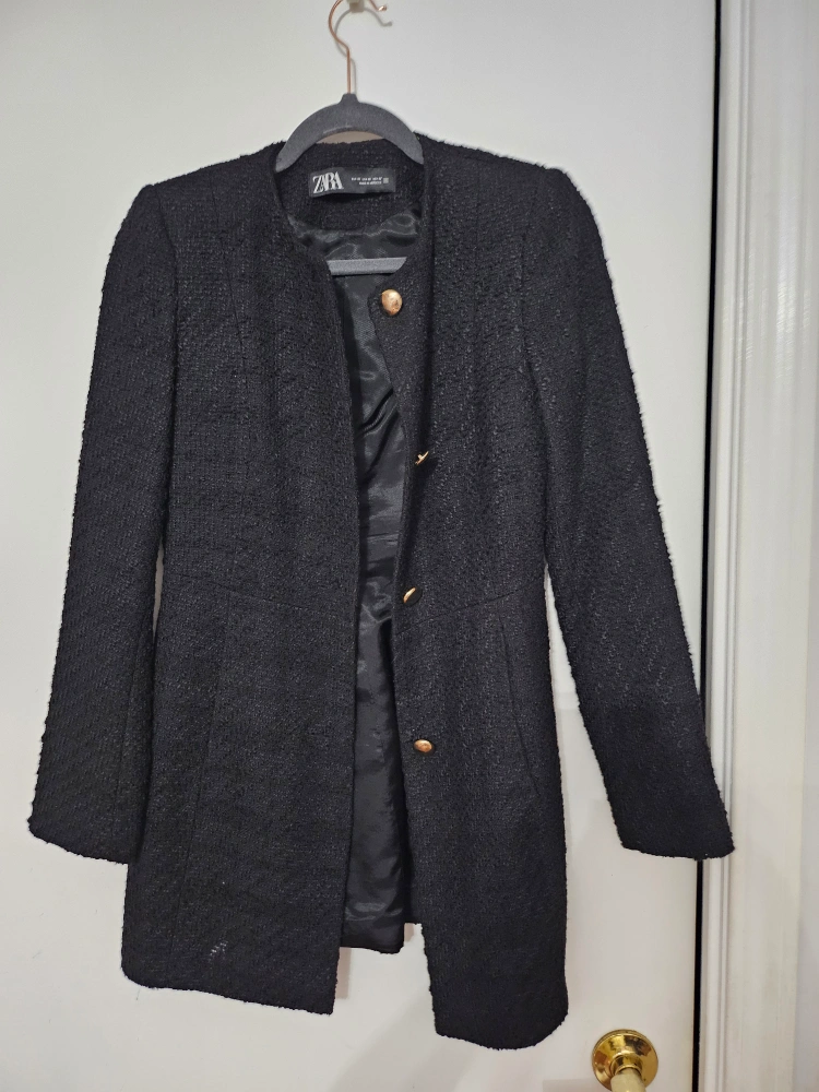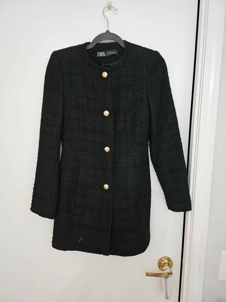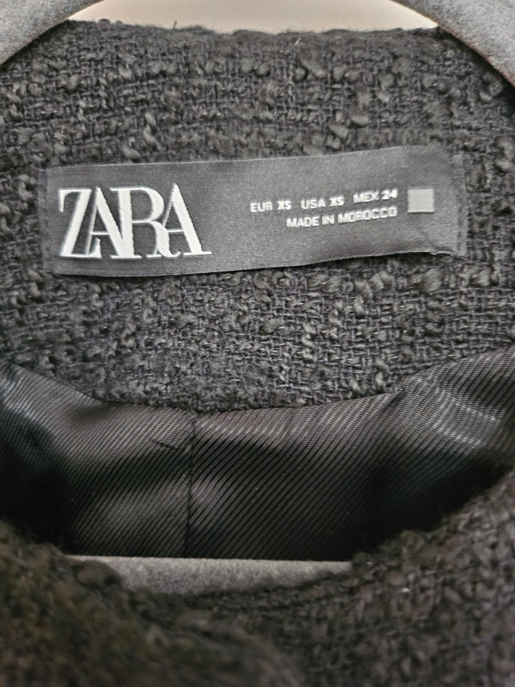 Selling a lovely black tweed coat from Zara in size XS. It's in great condition and perfect for adding a touch of elegance to any outfit. Made in Morocco