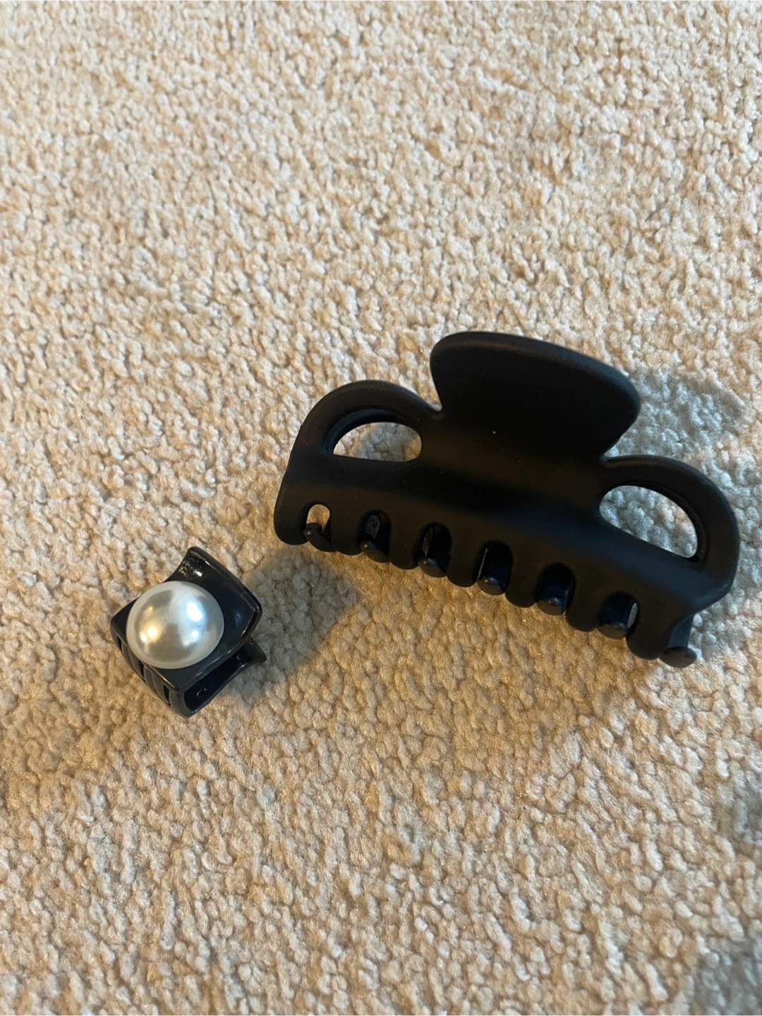Two cute hair clips for sale! One is a classic black claw clip, perfect for keeping your hair up. The other is a smaller clip with a pearl detail, adding a touch of elegance to any hairstyle