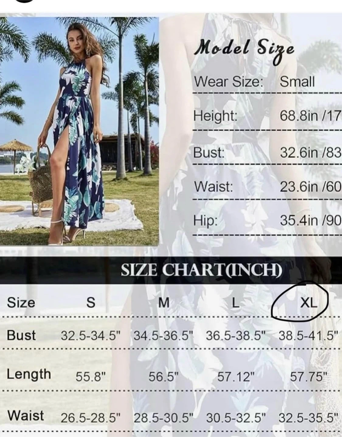 This is a beautiful floral maxi dress in size XL. It features a halter neckline and a high slit. The dress is perfect for summer days or evenings out. The size chart indicates the bust measures 38.5-41.5 inches and the waist measures 32.5-35.5 inches