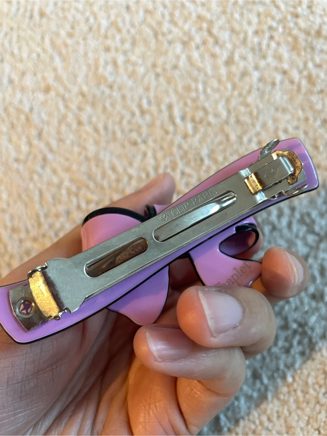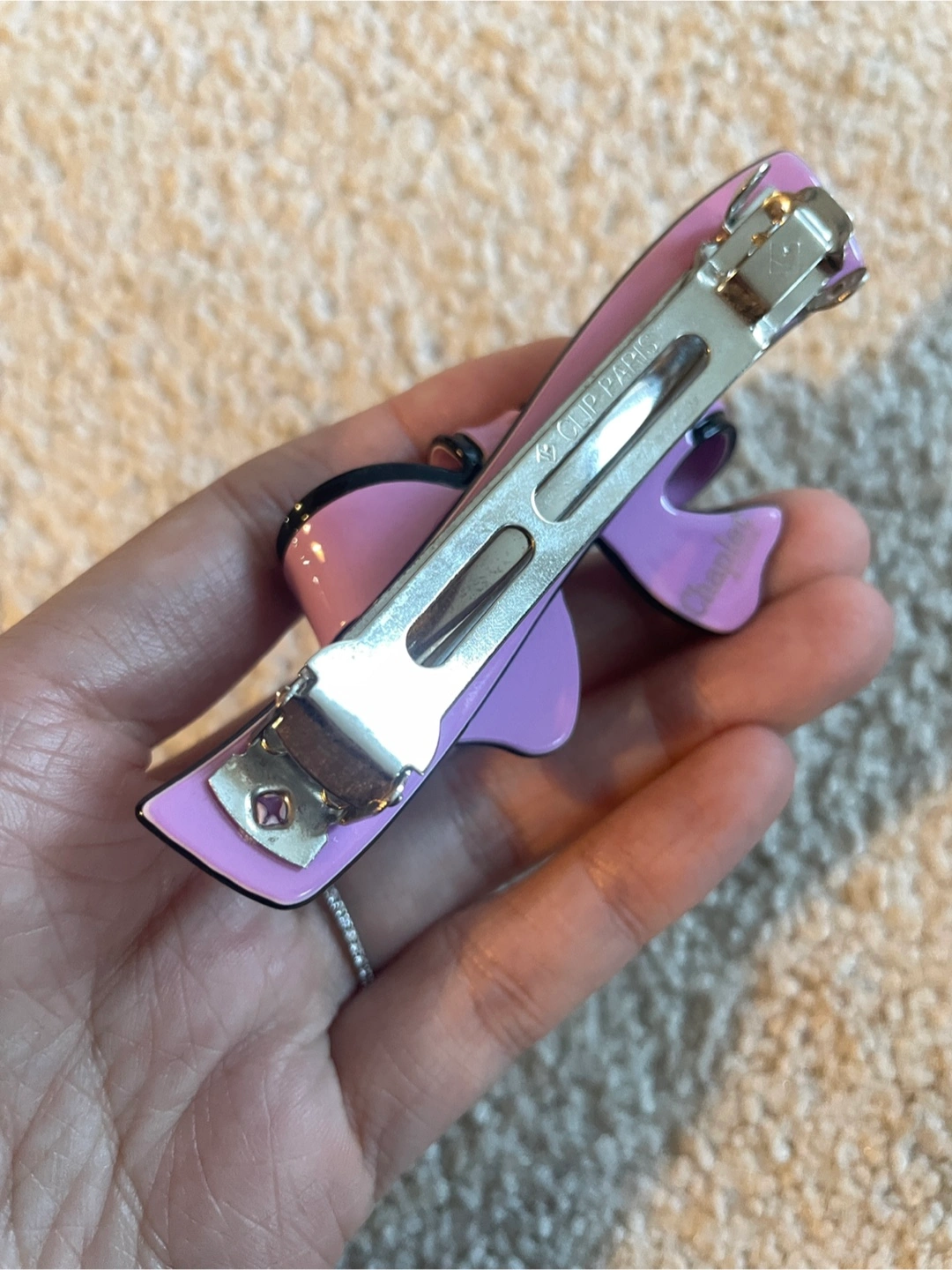 Add a touch of Parisian chic to your hairstyle with this adorable Clip Paris bow hair clip! It features a sweet pink bow with black trim, perfect for adding a pop of colour to any outfit. This stylish accessory is in great condition and ready to find a new home.